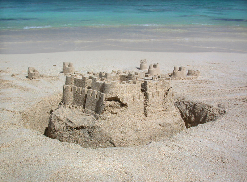 Na plaży budujemy zamek z piasku otoczony fosą, do której pozwalamy dziecku wlewać wodę.