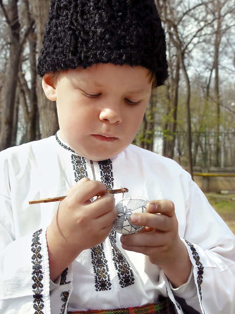 Trudniejszą tradycyjną techniką zdobienia wielkanocnych jajek jest malowanie ich woskiem tak, aby po barwieniu jaja i zdrapaniu wosku powstał jasny wzór (technika batikowa). Istnieją różne sposoby osiągnięcia takiego efektu. Najprostszym jest podgrzewanie wosku na małym ogniu, w starym garnuszku lub choćby na blaszanej zakrętce, i malowaniu na starannie umytym (do mycia można użyć odrobiny octu winnego), ugotowanym na twardo i osuszonym jaju (lub wydmuszce) wzorów poprzez zamaczanie szpilki/gwoździka/innego narzędzia w wosku i nanoszenie jego niewielkich ilości krótkimi kreskami (wosk szybko wysycha) na skorupkę. Po namalowaniu zaprojektowanego wzoru farbujemy jajo na wybrany kolor. Na koniec ostrożnie usuwamy warstwę wosku, odsłaniając chroniony przez nią jasny wzór.