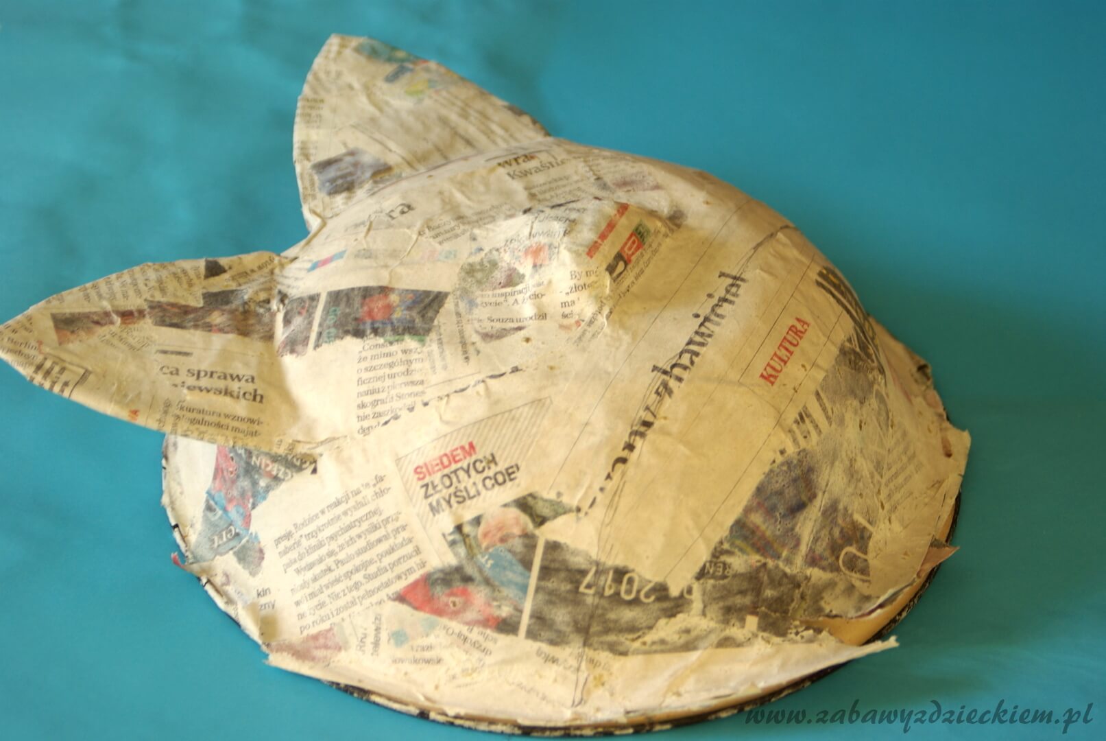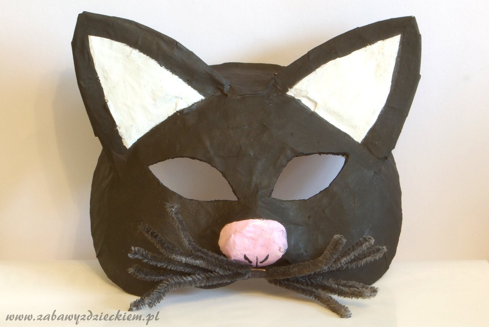 Do przygotowania kleju potrzebujemy na dwie porcje wody jedną porcję mąki. Najlepsza jest mąka tortowa. Rozrabiamy klej w misce tak, żeby był jednolity. Jeśli wyjdzie za gęsty, dodajemy wody, jeśli za rzadki – mąki. Maskę robimy na odpowiedniej misce lub nadmuchanym balonie. Miskę smarujemy oliwą, żeby potem łatwo było oderwać maskę od miski. Gazety rozrywamy na małe kawałki, paski. Na misce układamy paski gazety. Każdy pasek smarujemy klejem za pomocą pędzla malarskiego tak, by gazeta dokładnie nasiąkła klejem, wtedy kolejne warstwy gazety przyklejają się do siebie. W ten sposób uzyskujemy gładką grubą powierzchnię na misce. Jeśli chcemy uzyskać inny kształt, np. nos, wystające uszy, łuki brwiowe, to łatwo możemy to uzyskać poprzez zginanie lub formowanie nasiąkniętej klejem gazety. Uformowany z gazet nos przykładamy do maski, na nosie przykładamy kolejne warstwy gazety na płasko i smarujemy klejem – w ten sposób przyklejamy formę nosa do maski. Tak przygotowana maska musi wyschnąć. Odkładamy ją w ciepłe miejsce na całą noc. Następnego dnia delikatnie ściągamy maskę z miski i zostawiamy na kolejną noc, żeby wyschła dobrze od środka.