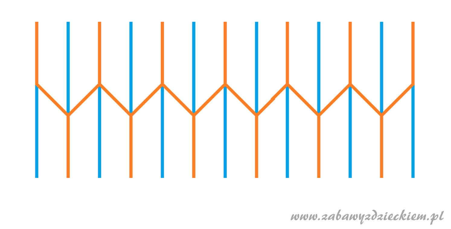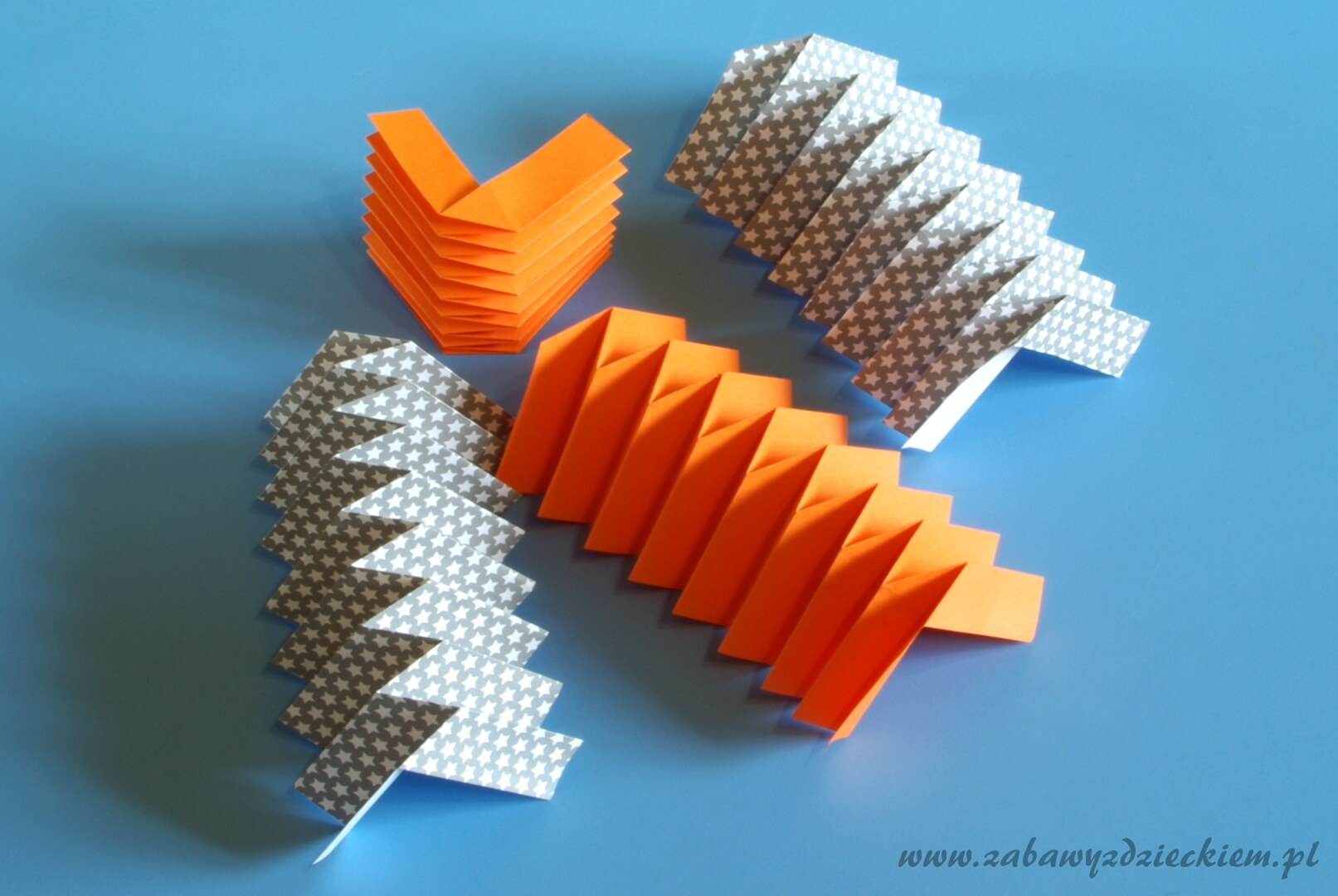 Kartkę przecinamy wzdłuż na pół. Musimy na niej wykonać zagięcia według poniższego schematu. Na rysunku schematycznym linie pomarańczowe są zagięciami wypukłymi (grzbietem do góry), linie niebieskie – wklęsłymi (grzbiet do dołu). Prostokątny arkusz składamy w harmonijkę w poprzek. Złożoną harmonijkę składamy mocno ukośnie, jak to pokazano na zdjęciu, po czym rozkładamy cały arkusz. Nie wszystkie zgięcia mają odpowiedni kierunek, więc poprawiamy je zgodnie z rysunkiem schematycznym. W ten sposób składamy „złamaną” harmonijkę.