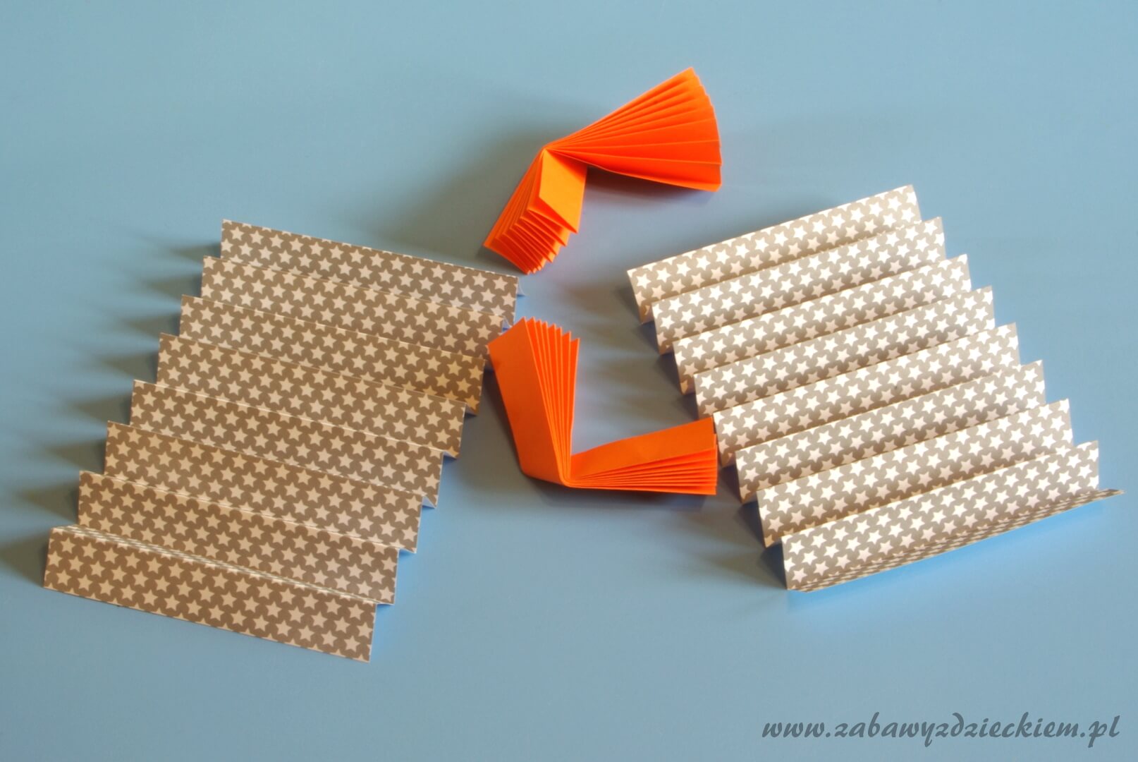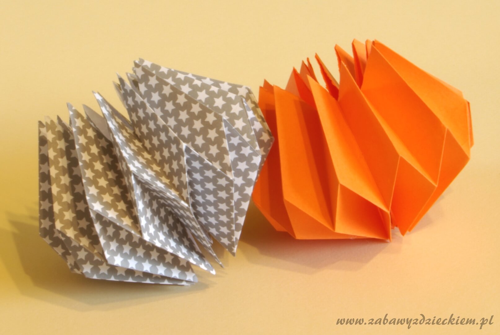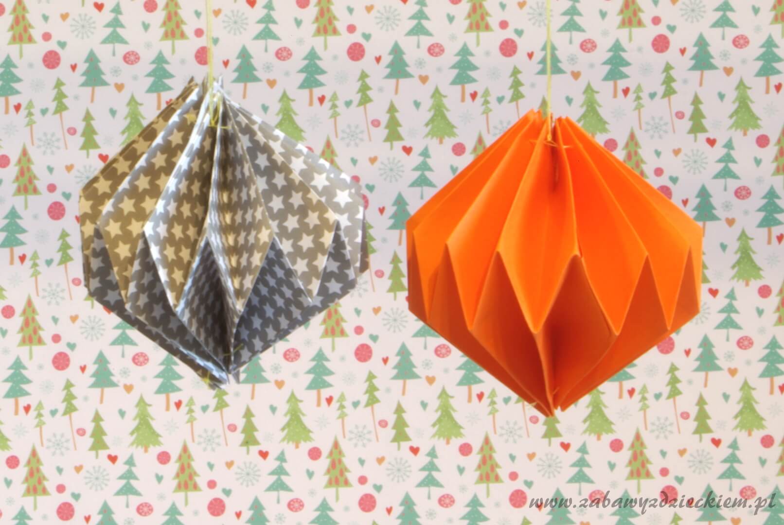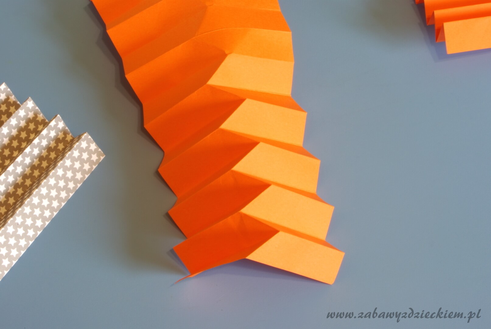 Do zrobienia bombki potrzebujemy dwóch tak przygotowanych harmonijek. Ich końce sklejamy ze sobą, tworząc pierścień. Przeciągamy nitkę przez wszystkie zakładki, jak najbliżej czubka, ściągamy ją i zawiązujemy. To samo robimy po drugiej stronie pierścienia, zostawiając dłuższe końce nitki na zawieszkę. W ten sposób powstanie trójwymiarowa bombka z harmonijki.