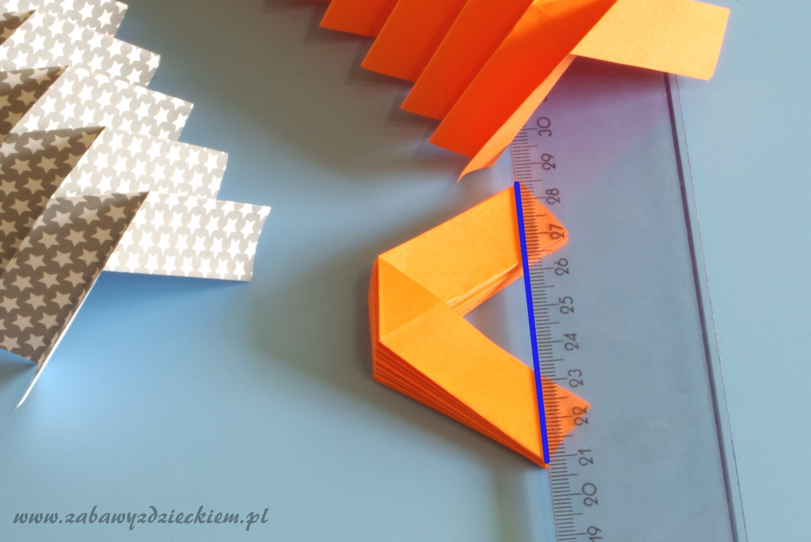 Gotową harmonijkę spłaszczamy i przycinamy dolne końce (wzdłuż granatowej linii pokazanej na poniższym zdjęciu ) tak, by tworzyły jedną linię.