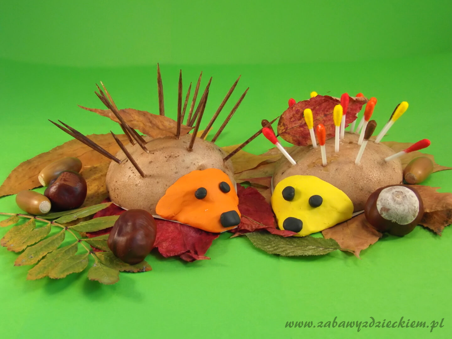 Duży ziemniak przekrawamy na pół – uzyskujemy w ten sposób dwa jeżyki. Jednemu jeżykowi robimy kolce z wykałaczek. Wykałaczki można pomalować na brązowy lub inny dowolny kolor. Wykałaczki wbijamy w ziemniaka. Dla drugiego jeżyka kolce możemy przygotować z patyczków do czyszczenia uszu. Z jednej strony ściągamy watę. Jeśli patyczki są za długie, można je skrócić. Drugi koniec z watą malujemy mazakami lub farbami. Tak przygotowane patyczki wbijamy w ziemniak. Następnie jeżykom robimy pyszczki. Można je uformować z plasteliny lub wyciąć z kolorowego papieru, namalować oczy, nosek i buzię, oraz przykleić pyszczek do ziemniaka.