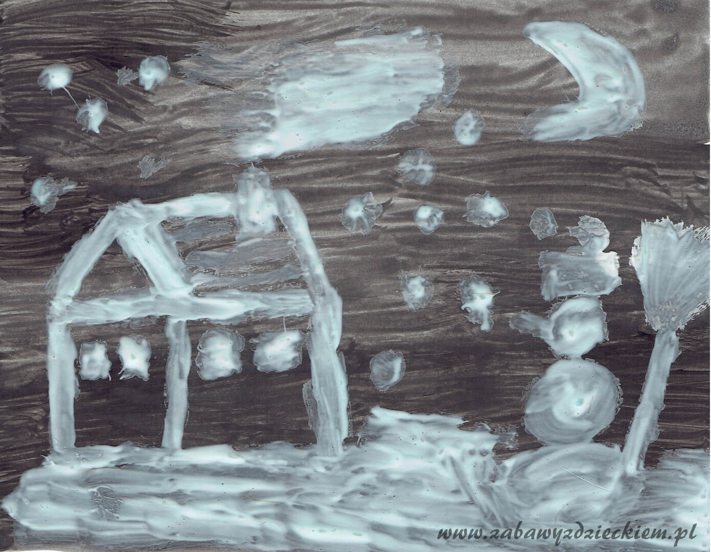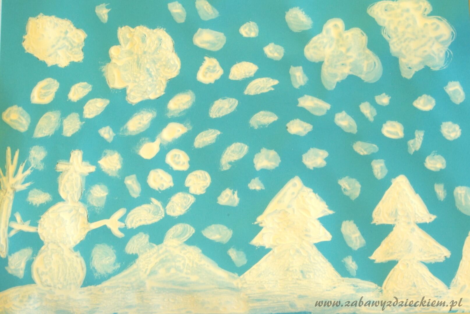 Na niebieskiej kartce będziemy tworzyć zimowy krajobraz. Z kolorowego papieru wycinamy elementy tła: słońce, drzewa iglaste, kapelusz, nos, szalik i guziki dla bałwanka. Poszczególne elementy przyklejamy do kartki w odpowiednim miejscu. Pędzelek maczamy w paście do zębów i malujemy na kartce bałwana, ośnieżone góry, pola, śnieg na choinkach, drzewach, białe chmury i spadający śnieg. Jeśli pasta jest zbyt gęsta, możemy dodać odrobinę wody. Zanim pasta wyschnie na kartce, możemy patyczkiem dorysować na niej niektóre elementy i szczegóły, np. dachówkę, igły na choince.