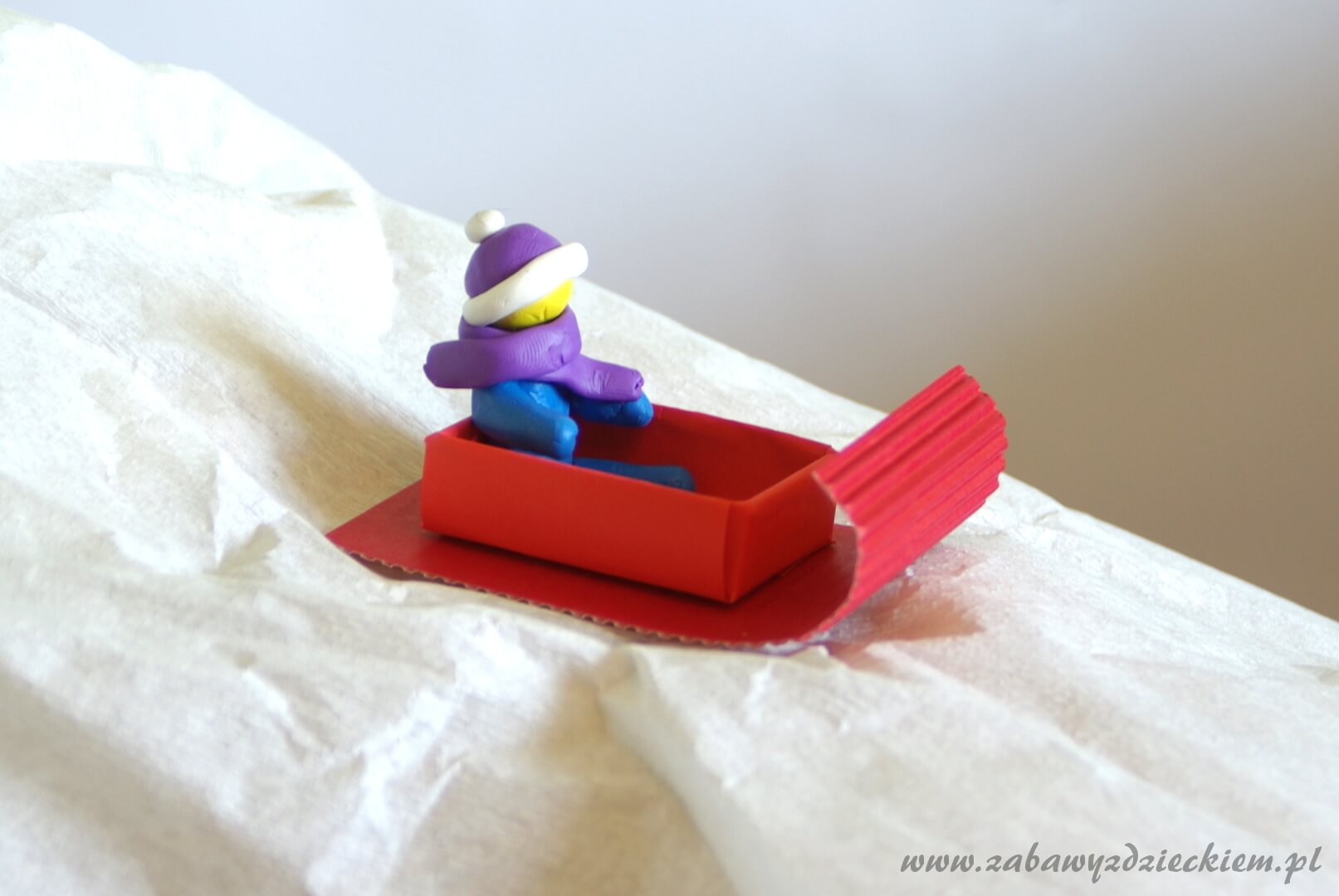 Z falistej tektury wycinamy prostokąt większy od pudełka po zapałkach. Koniec prostokąta zakręcamy do góry. Do niego przyklejamy środkową część z pudełka po zapałkach, którą możemy obkleić papierem kolorowym. W ten sposób otrzymamy sanki. Do sanek wkładamy ludzika ulepionego z plasteliny. Z białej bibuły możemy przygotować imitację ośnieżonej górki.