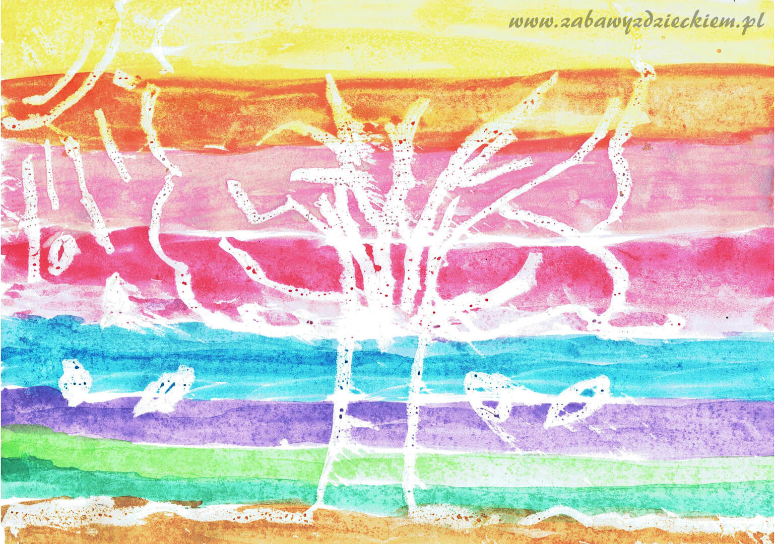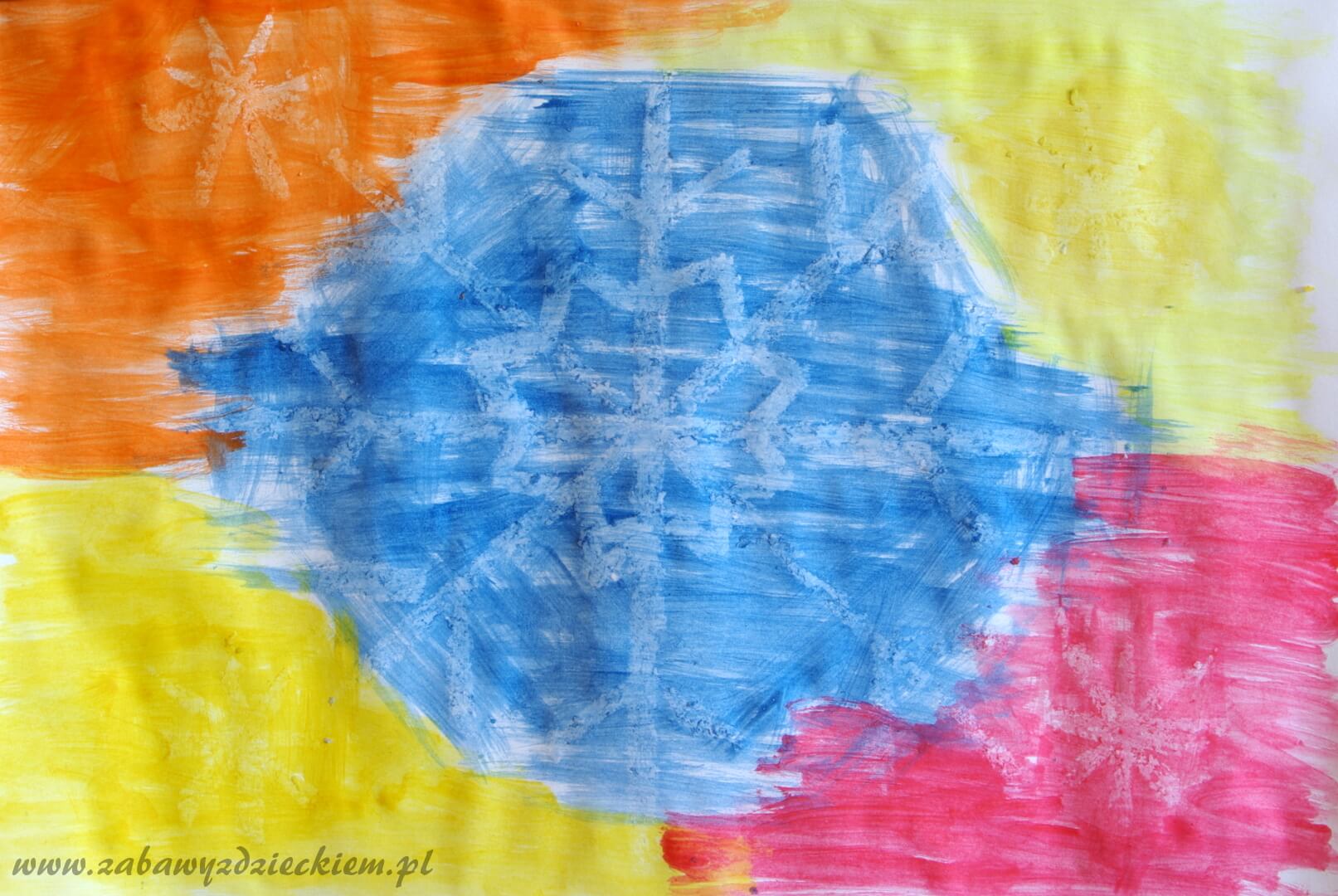 Na kartce „rysujemy” świecą obrazek zgodnie z wcześniej wymyśloną koncepcją, dociskając jak najstaranniej świecę do kartki, dzięki czemu obrazek będzie potem dobrze widoczny. Następnie dość mocno rozwodnioną farbą malujemy kartkę – można użyć kilku kolorów do pokrycia całej kartki. Po zamalowaniu kolorem całej kartki ukaże się nam rysunek, który wcześniej wykonaliśmy świecą.