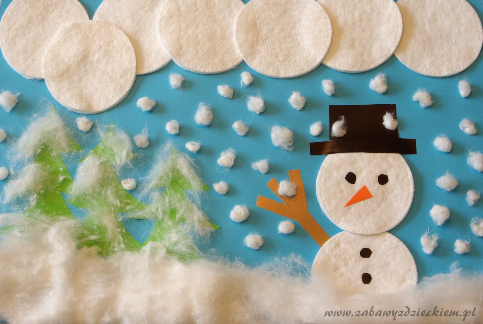 Na kartce tworzymy zimowy krajobraz, głównie z płatków kosmetycznych i waty. Płatki możemy wykorzystać na bałwana, chmury, pagórki, drzewa. Watę przyklejamy na gałęziach drzew, na ławkach, dachach, płotach. Z waty możemy uformować malutkie kuleczki i przykleić je jako padający śnieg. Brakujące elementy uzupełniamy farbami lub wycinany z papieru kolorowego.