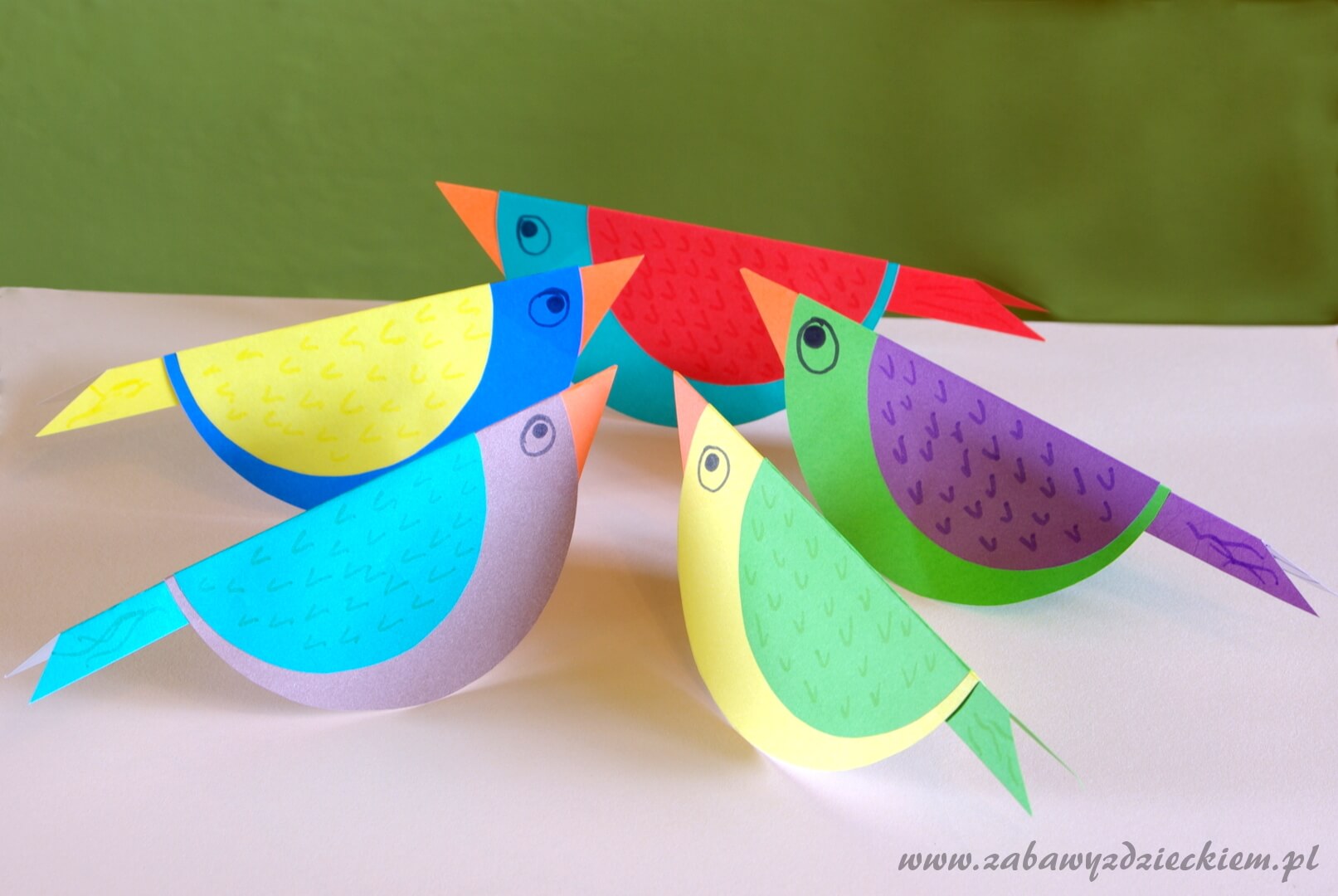 Z dwóch kartek w różnym kolorze wycinamy dwa różnej wielkości kółka. Składamy je na pół. Większe kółko jest tułowiem ptaszka. Mniejsze kółko przyklejamy na tułów – w ten sposób otrzymujemy skrzydła ptaszka. Z kolejnego papieru wycinamy kwadracik, który składamy wzdłuż przekątnej – będzie to dziób ptaszka. Przyklejamy go z jednej strony tułowia od strony wewnętrznej. Z kolejnej kolorowej kartki wycinamy prostokąt, który składamy wzdłuż na pół. Z jednej strony wycinamy lub nacinamy ogon według uznania, by uzyskać pożądany kształt ogonka. Przyklejamy go z drugiej strony tułowia tak jak dziób. Mazakami możemy jeszcze domalować ptaszkowi oczy.