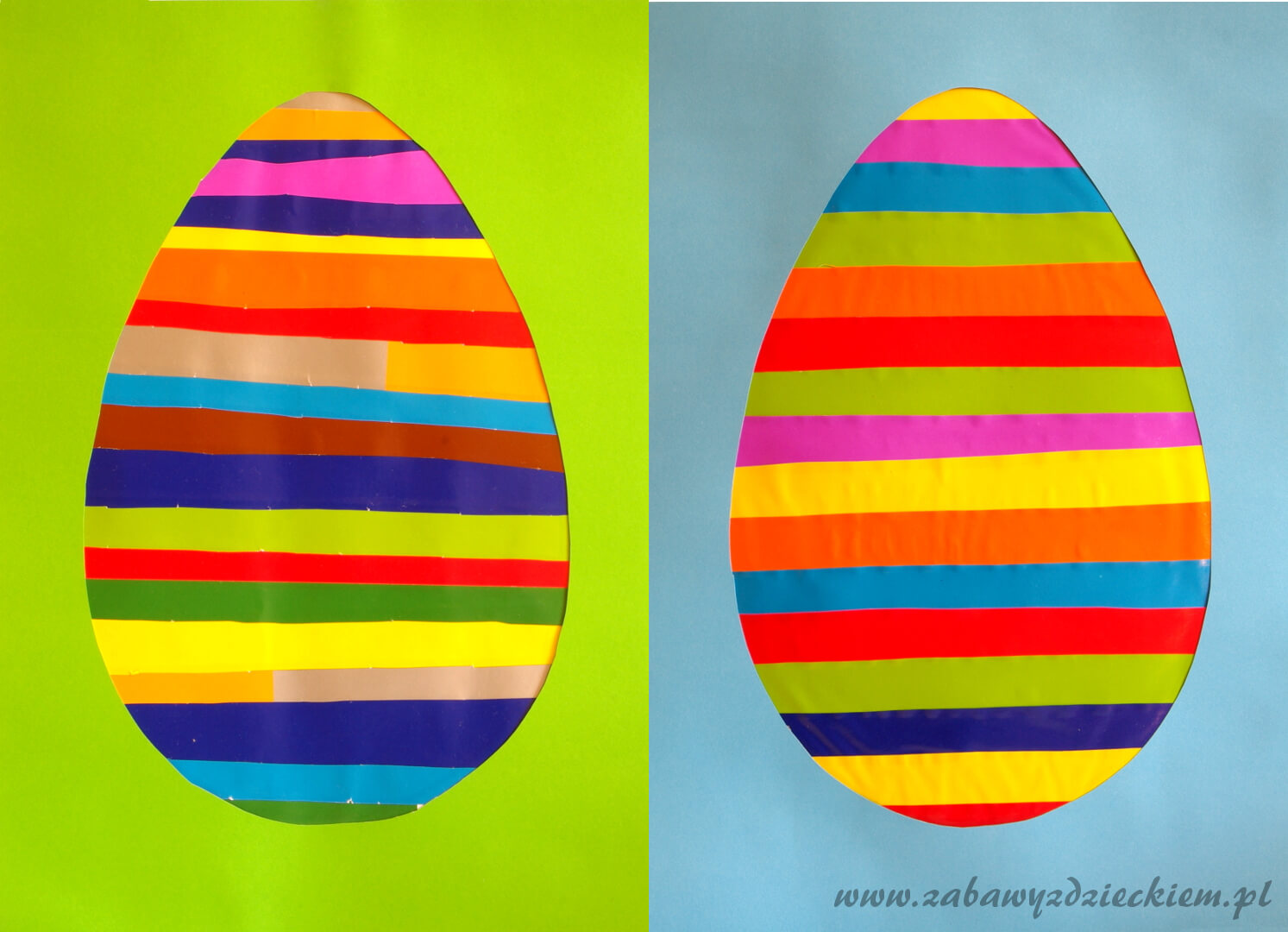 Z kolorowego papieru, bibuły lub wstążek wycinamy paski długości nie większej jak szerokość kartki A4, ale dowolnej grubości. Im więcej kolorów pasków, tym ciekawsze jajo wielkanocne wyjdzie. Białą kartkę A4 smarujemy klejem i naklejamy w dowolnej kolejności paski na kartce, jeden pod drugim. Na kartce powstanie w ten sposób kolorowa paskowa abstrakcja.