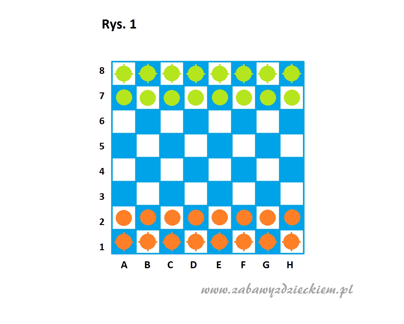 Jest to starożytna gra dla dwóch osób. Każdy z graczy dysponuje szesnastoma pionkami. Osiem pionków trzeba oznakować odpowiednio (np. nitką, plasteliną, naklejką, zmywalnym markerem), są to dowódcy. Pozostałe pionki są żołnierzami. Pionki na planszy ustawiamy tak, jak to pokazano na rys. 1. Dowódcy stoją na krańcowych rzędach planszy (kółko z krzyżykiem), żołnierze przed nimi.