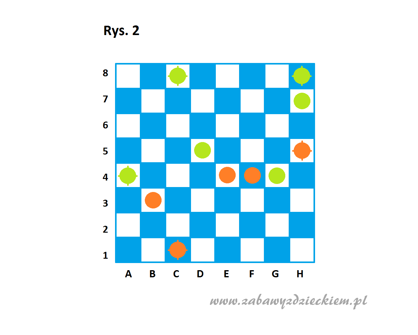 Na rys. 2 jest pokazana przykładowa rozgrywka. Gracz z pomarańczowymi pionkami ma cztery możliwości bicia pionków przeciwnika: