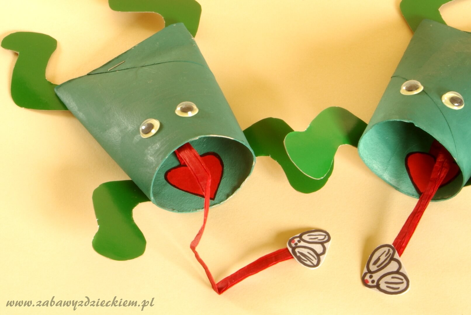 Z czerwonego papieru wycinamy serduszko i przyklejamy wewnątrz rolki jako język. Możemy jeszcze przykleić zrobione z papieru oczy lub wykorzystać gotowe ruchome oczy.