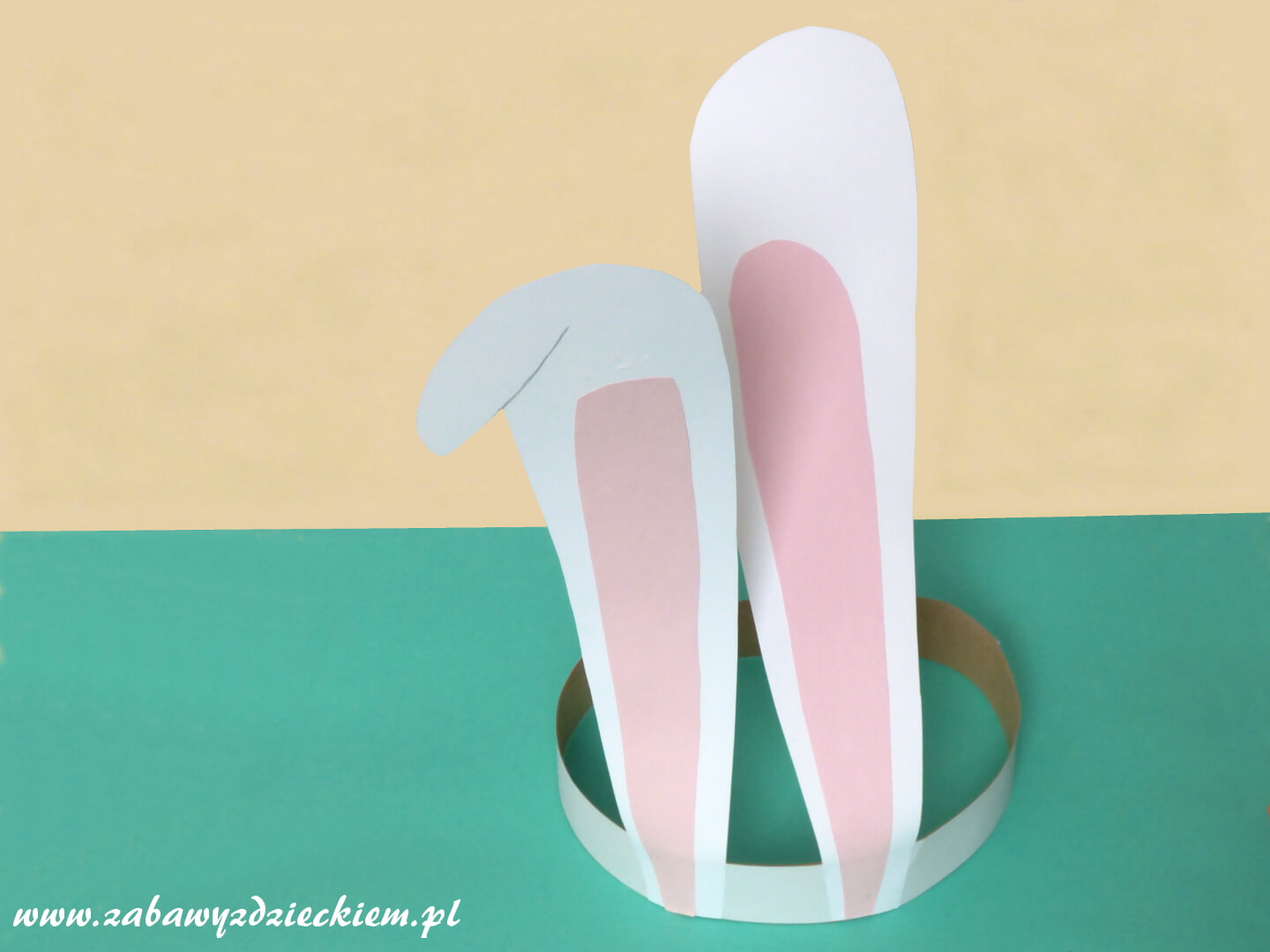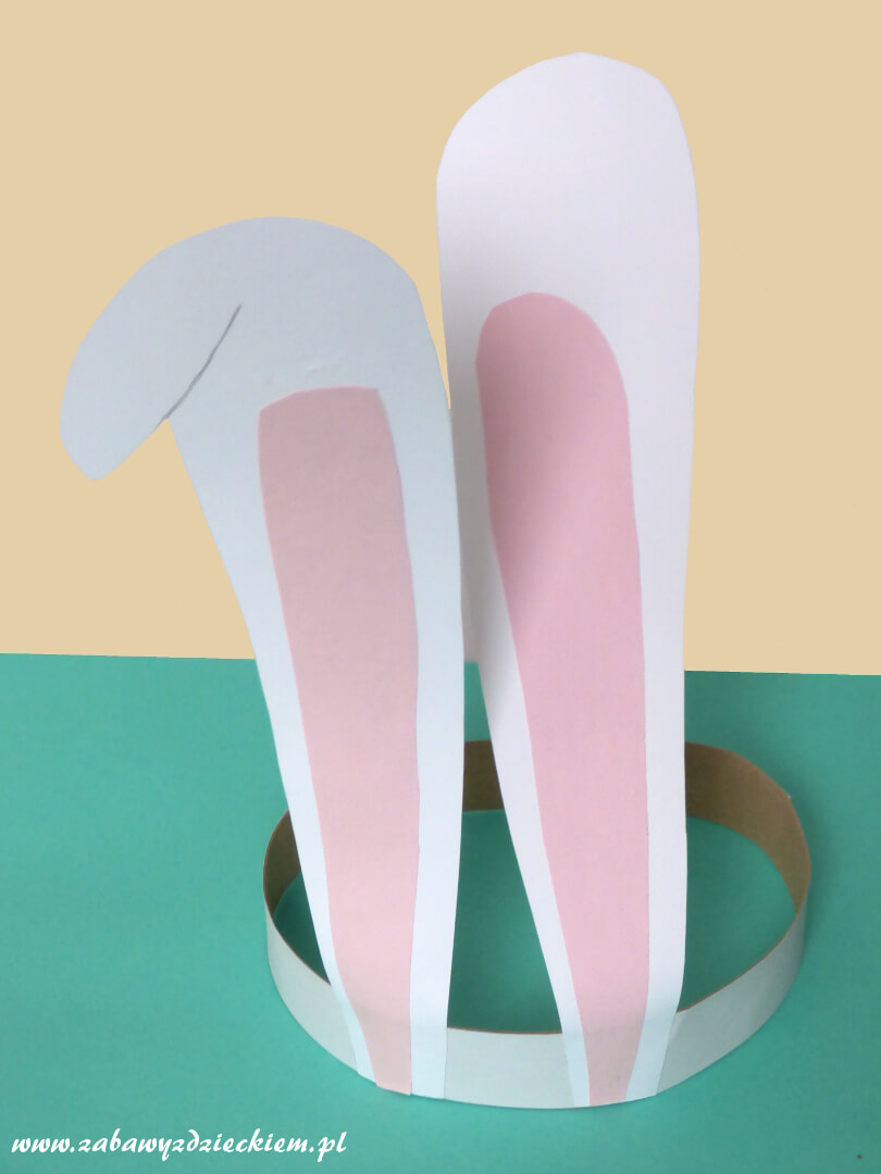 Na początek z kartonu wycinamy pasek, który będzie stanowił bazę opaski. Obwód opaski należy dostosować do rozmiaru głowy. Następnie łączymy końce paska ze sobą, klejem lub biurowym zszywaczem. Potem z bloku technicznego wycinamy kształt długich uszu zająca, a ich środki wykonujemy z kolorowego papieru. Gotowe uszy przyklejamy do opaski.