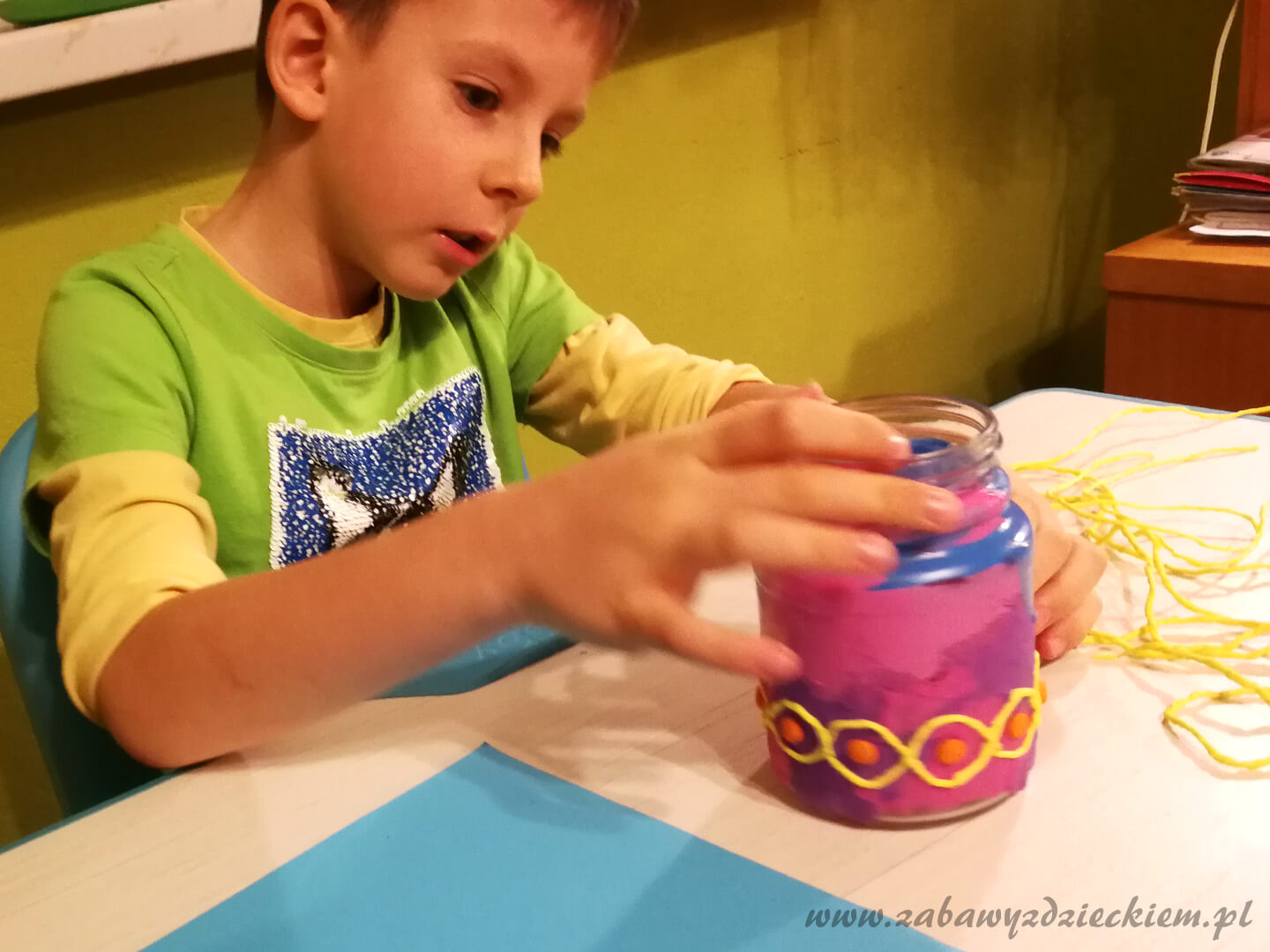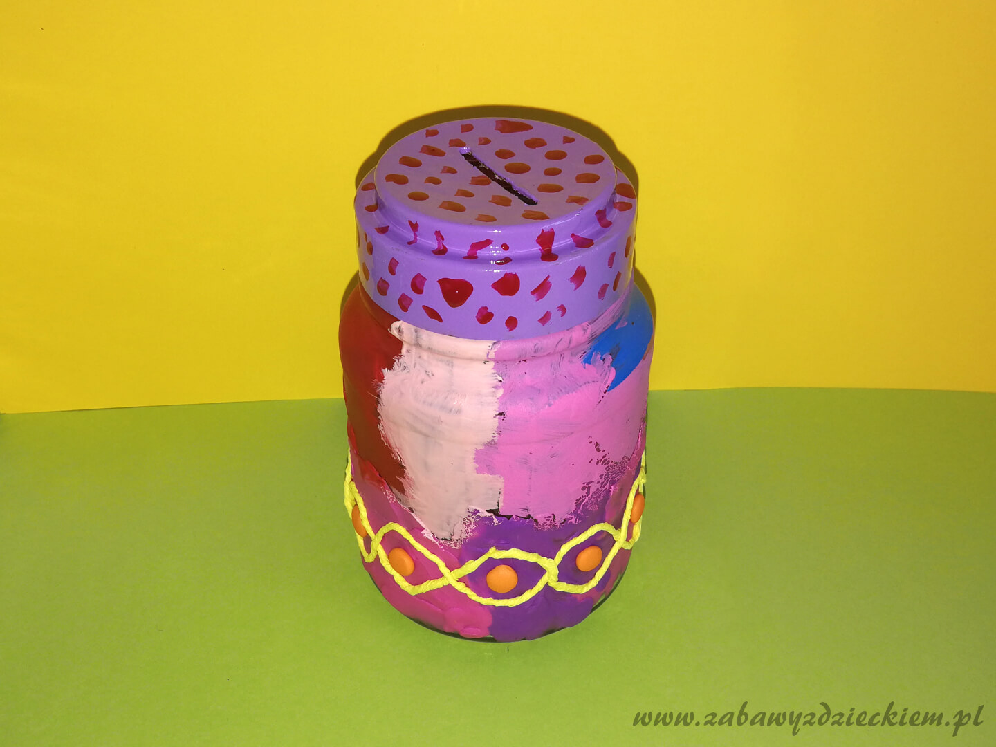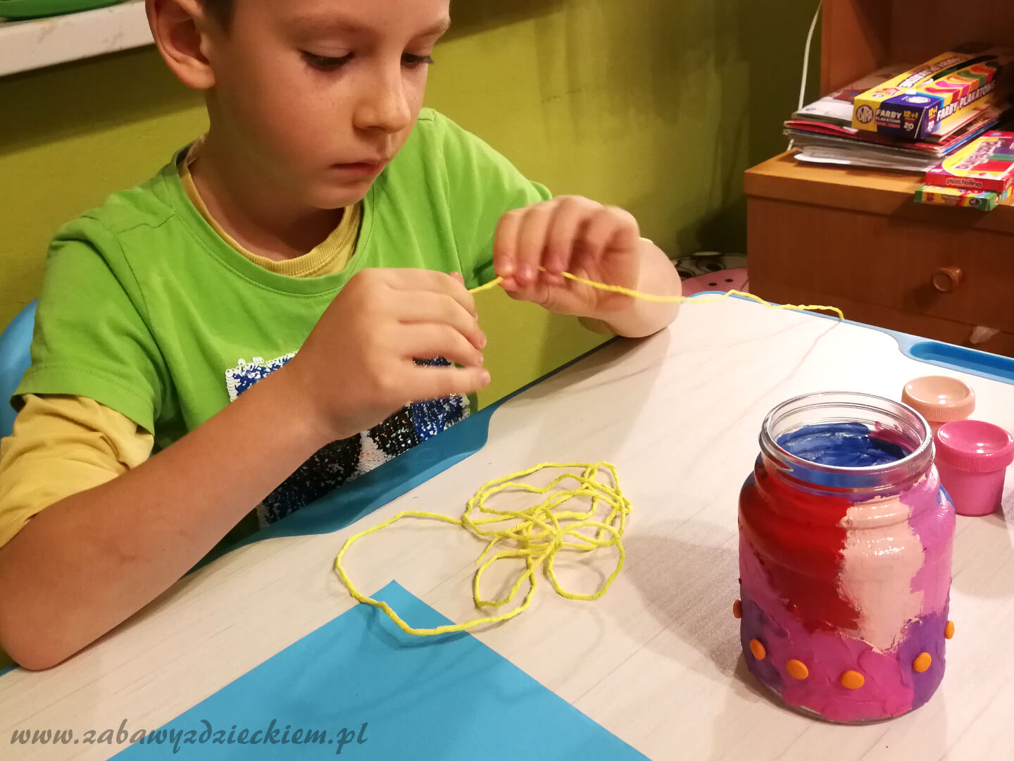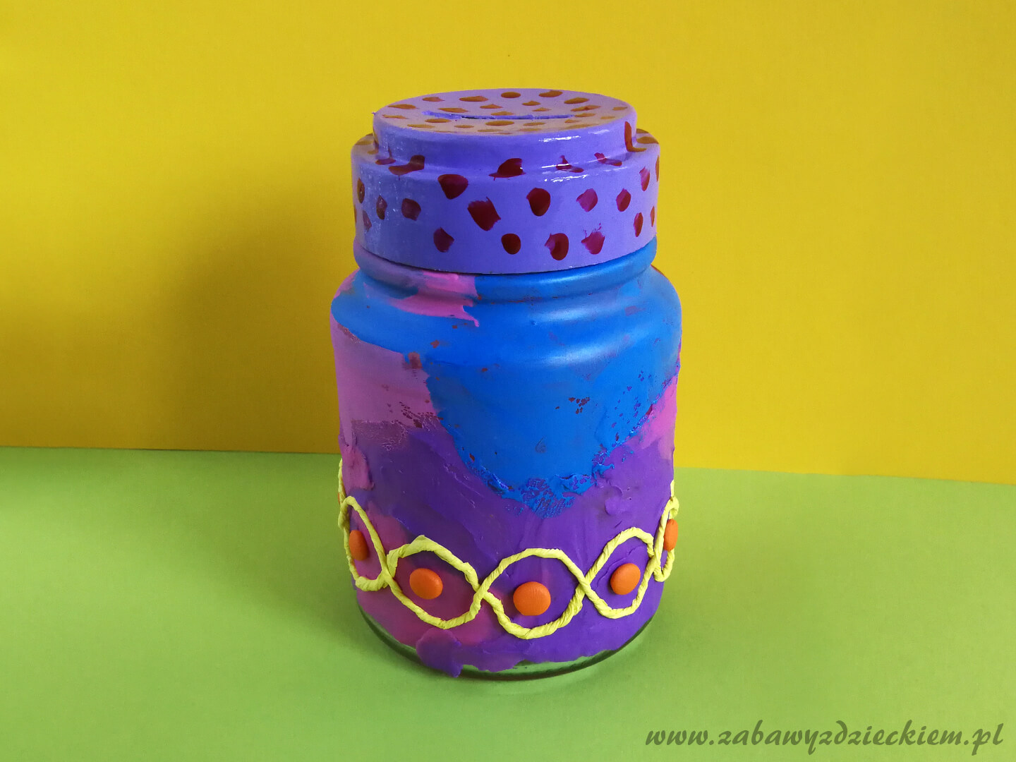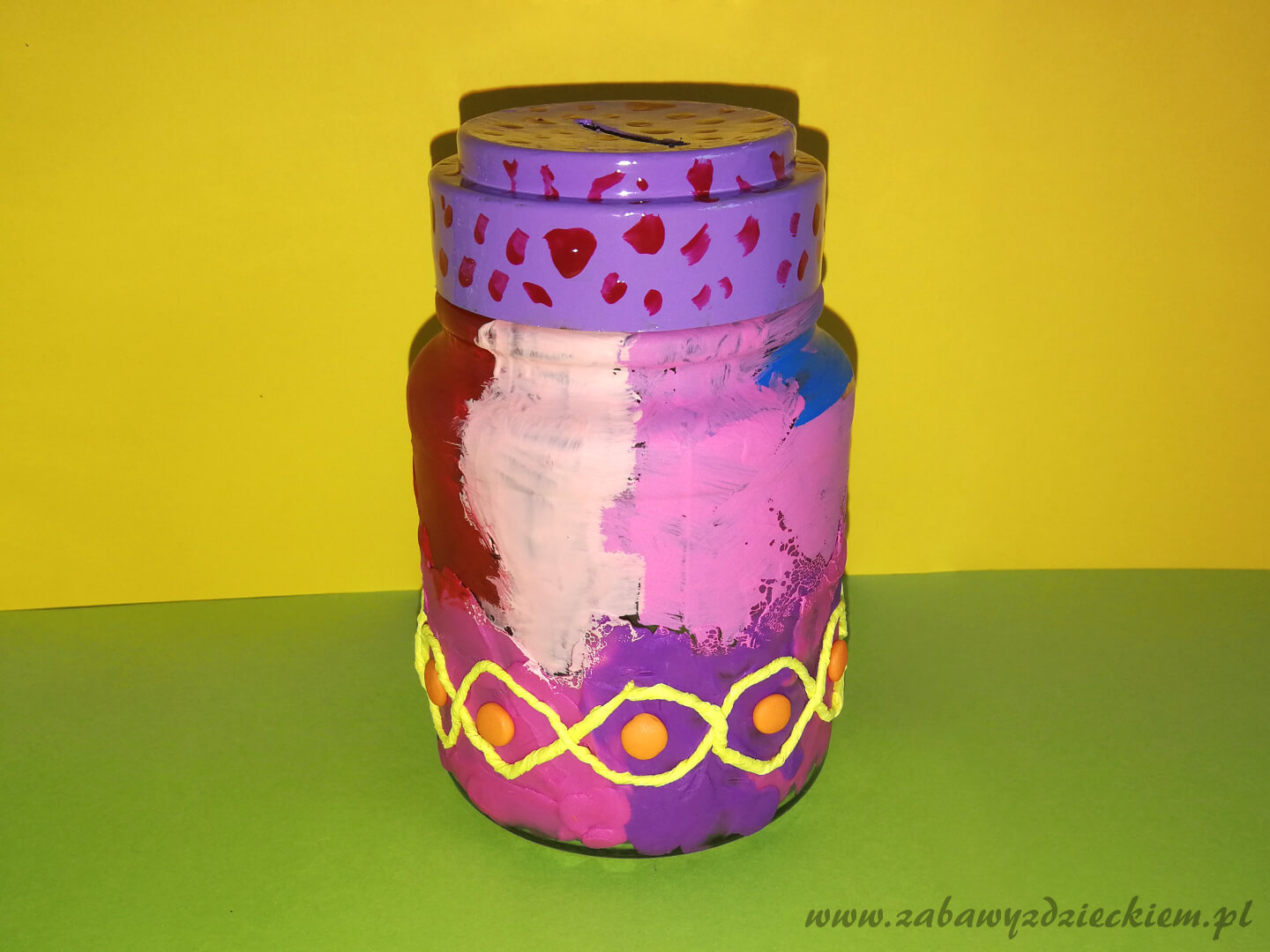 W naszym przykładzie słoik jest wyklejony od dołu do połowy wysokości plasteliną, a górna część została pomalowana farbami plakatowymi. Na dolnej części przyklejone są uformowane z plasteliny kulki oraz sznurek skręcony z żółtej krepiny