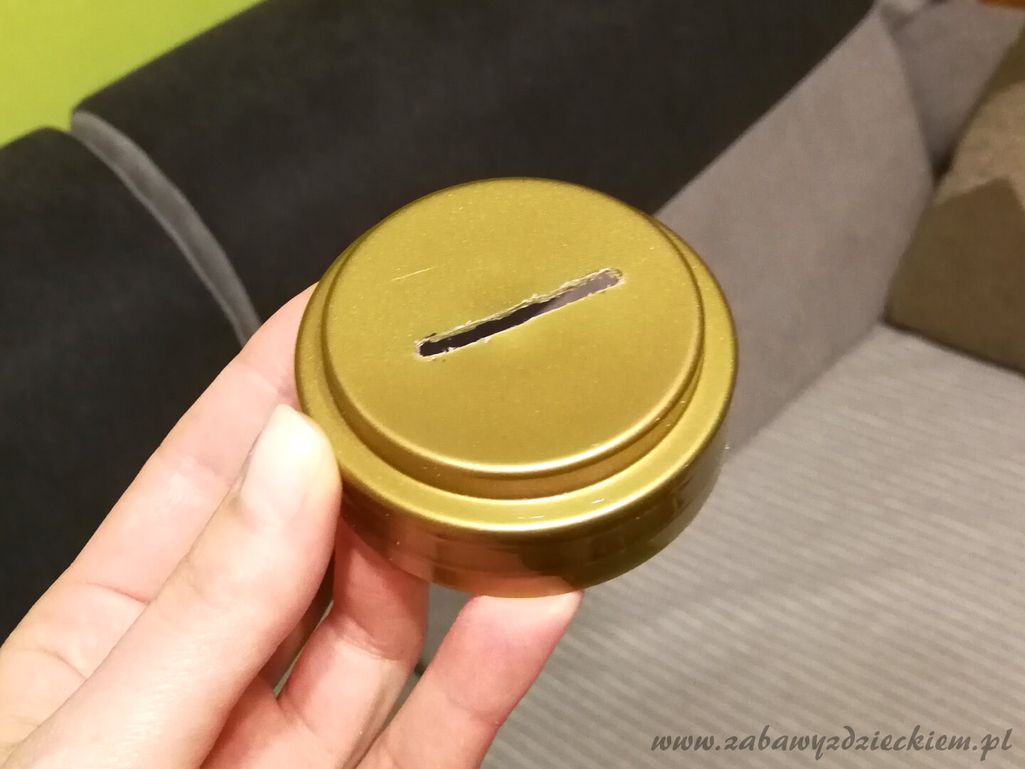 W nakrętce trzeba nożem lub ostrym narzędziem zrobić otwór (łatwiej będzie poradzić sobie z plastikową), przez który będzie się dało wrzucać monety i złożone banknoty. To zadanie lepiej zlecić dorosłej osobie ze względu na ryzyko zranienia.