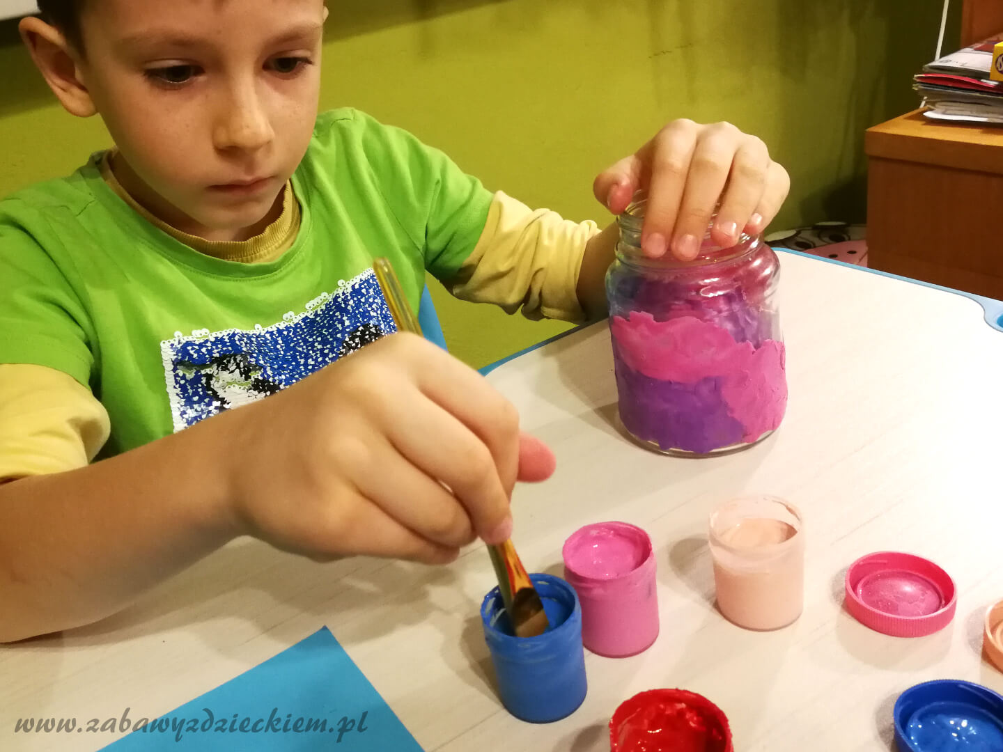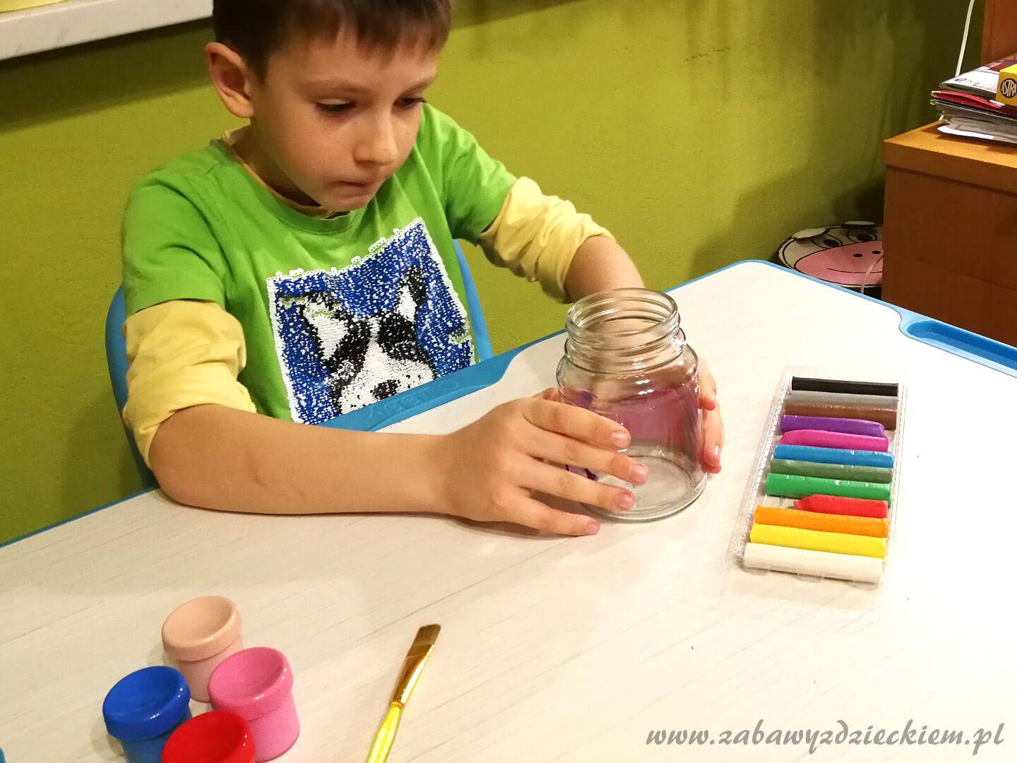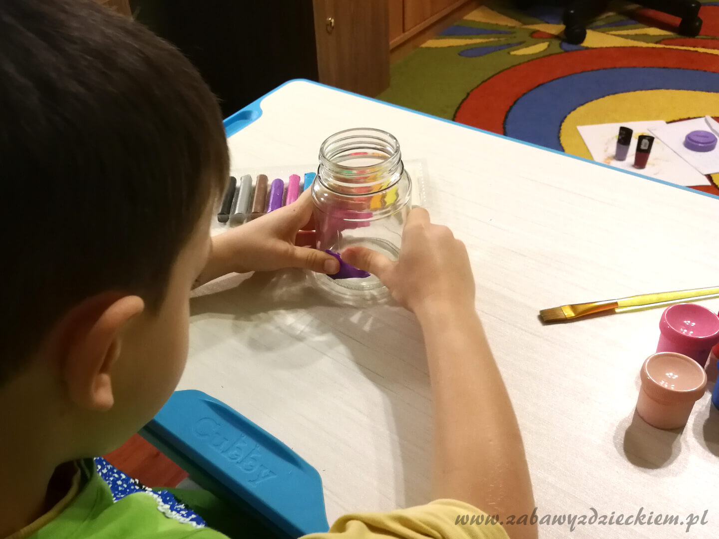 słoik z nakrętką, plastelina, farby plakatowe, klej kropelka lub inny mocny klej, nóż, ew. bibuła karbowana, papier kolorowy, guziki, cekiny, koraliki