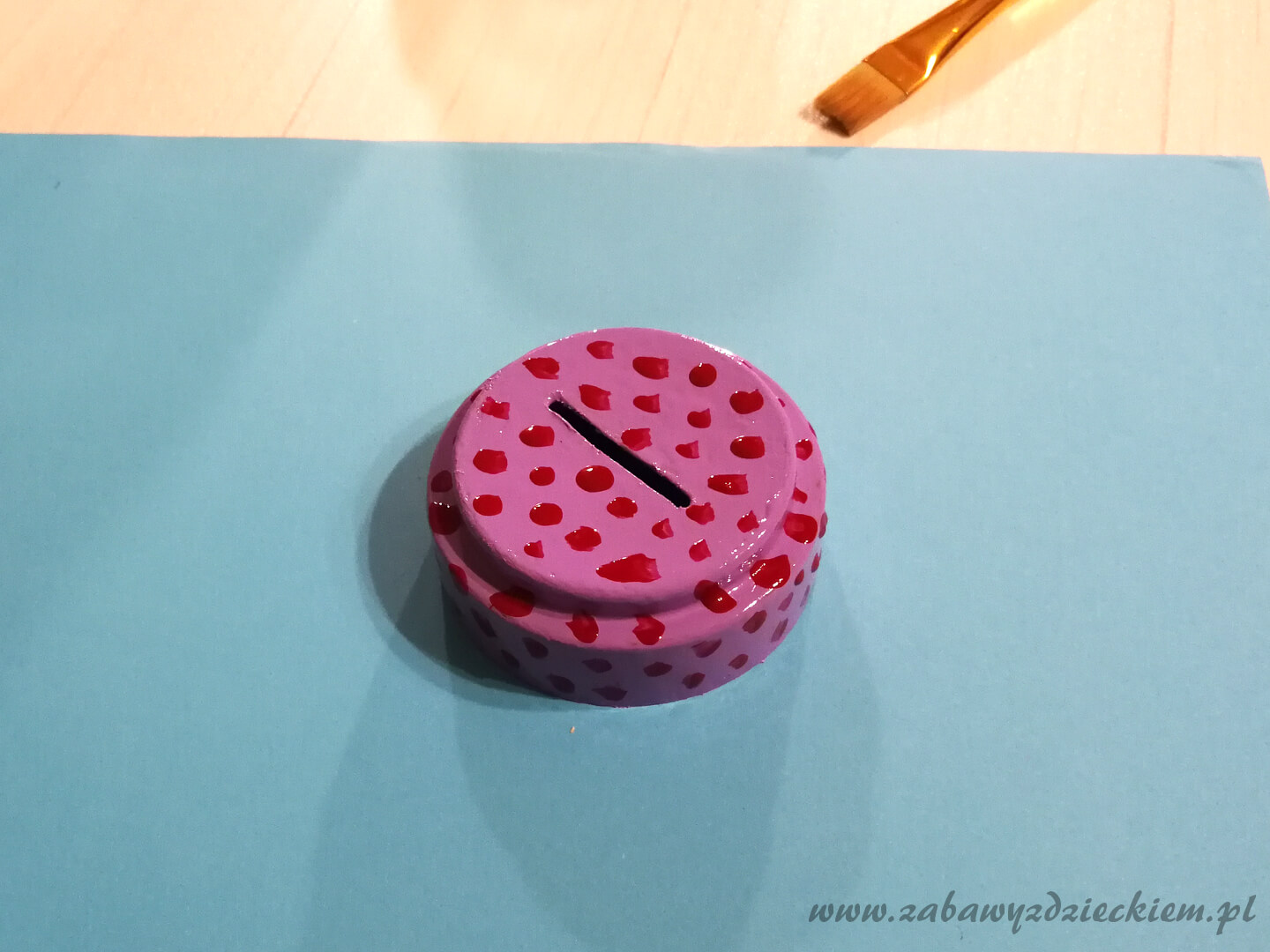 Następnie zabieramy się za ozdabianie skarbonki. Malujemy nakrętkę farbami plakatowymi. Aby farba dobrze pokrywała powierzchnię, lepiej nie rozcieńczać jej zbytnio wodą. Możemy pomalować całą nakrętkę jednym kolorem, a po wyschnięciu tej pierwszej warstwy domalować jakiś wzór innym. Jeśli w domu są zbędne kolorowe lakiery do paznokci, możemy ich użyć do dodatkowego udekorowania malunku. Odkładamy nakrętkę do wyschnięcia.