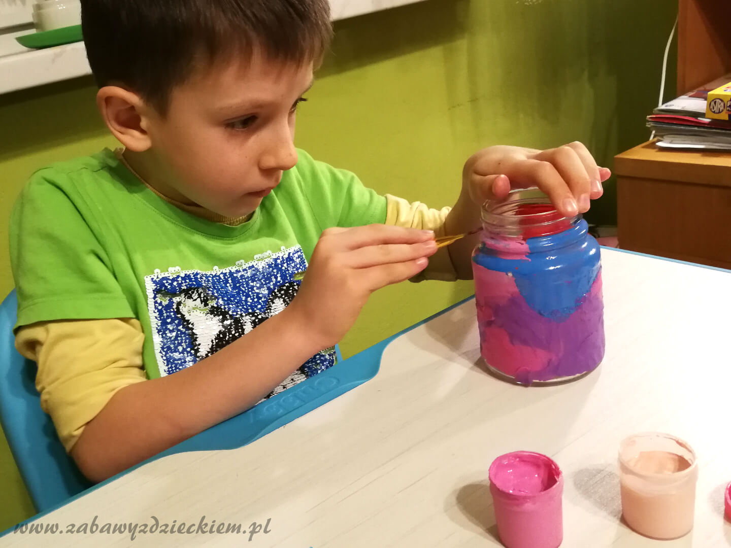 Teraz zajmiemy się słoikiem. Na szkle trzymają się gęste farby plakatowe i plastelina, możemy więc pomalować go lub wykleić w całości plasteliną, wymyślając przy tym kolorowe wzory. Jeśli użyjemy plasteliny, to dodatkowo można wykonać żłobienia patyczkiem, a na wierzch przykleić bibułę, papier kolorowy, cekiny, koraliki, guziki i inne ozdoby.