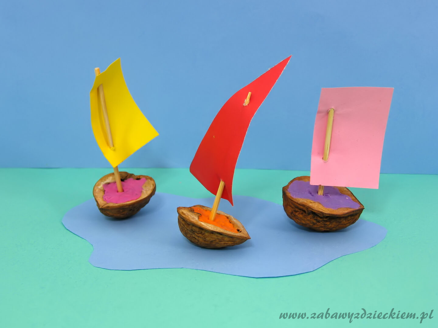 Potrzebne będą pełne połówki łupin z orzecha włoskiego. Łupiny wypełniamy watą, którą zakrywany plackiem ulepionym z plasteliny – musimy przymocować brzegi ulepionego placka do łupinki. Następnie z papieru wycinamy trójkąty lub trapezy – posłużą jako żagle. Żagle możemy pomalować dowolnie kredkami, farbami lub mazakami. W żaglach robimy dwie dziurki, przekładamy przez nie wykałaczkę i gotowy żagiel z masztem wbijamy w plastelinę w łupinie. Tak zrobioną łódkę możemy przetestować na wodzie.