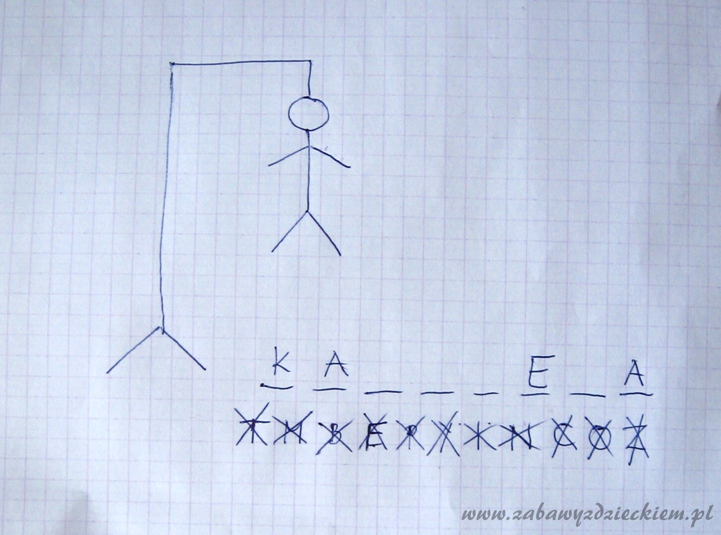 Gra dla 2 osób. Jedna z nich wymyśla słowo i zapisuje na kartce tyle kresek, ile liter ma wymyślone słowo. Druga osoba próbuje odgadnąć to słowo, podając litery alfabetu, o których sądzi, że się w nim znajdują. Jeśli dana litera znajduje się w słowie, wymyślający wpisuje ją nad kreseczkami (we wszystkich miejscach w słowie, w których występuje ta litera). Jeśli litera podana przez odgadującego nie znajduje się w słowie, wymyślający zaczyna rysować szubienicę (a potem ludzika na niej), po jednej kresce na nieodgadniętą literę (wzór obrazka na zdjęciu). Jeśli odgadujący domyśla się (po liczbie kresek i wpisanych już literach), jakie słowo zostało ukryte, podaje je i wygrywa, o ile szubienica nie jest jeszcze skończona. Jeśli poda błędną propozycję, do szubienicy dorysowywany jest kolejny element. Jeśli wymyślający narysuje szubienicę, zanim odgadujący rozpozna słowo, zwycięstwo jest jego. Trudność zabawy można modyfikować, zwiększając lub zmniejszając liczbę umówionych przed rozpoczęciem gry elementów karnego obrazka.