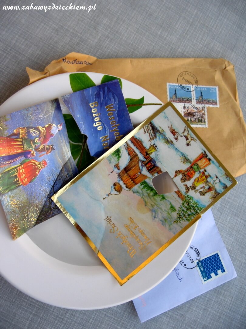 talerz lub inny pojemnik na wodę, woda, koperty lub kartki pocztowe ze znaczkami