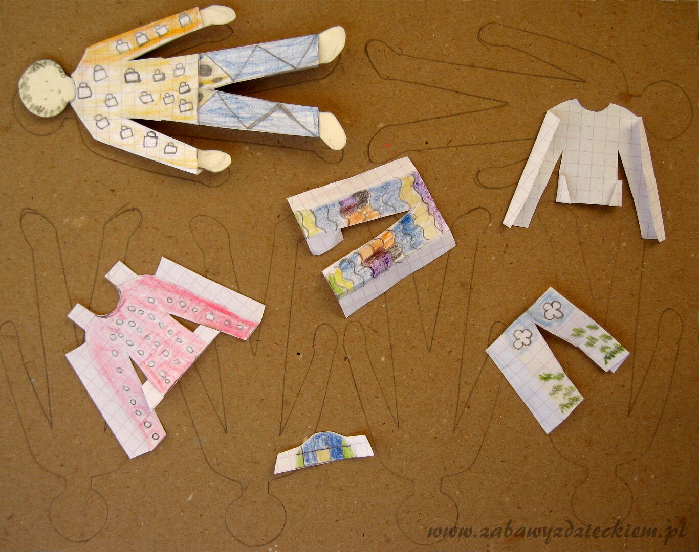 Zajmującą zabawą nie tylko dla dziewczynek jest projektowanie ubrań i zabawa lalkami z papieru. Wykonanie: na kartonie rysujemy zarys sylwetki laleczki. Powinien być dość prosty, aby można go było łatwo wyciąć. Rysujemy laleczce oczy, nos, buzię, włosy. Przykładamy ją do cienkiej kartki papieru i robimy obrys. Na nim projektujemy ubranka, do których trzeba dorysować specjalne zaczepy (widoczne na zdjęciu), z którymi wycinamy garderobę. Po wycięciu możemy stroić lalki w ubranka mocowane na zaczepach. Miłej zabawy!