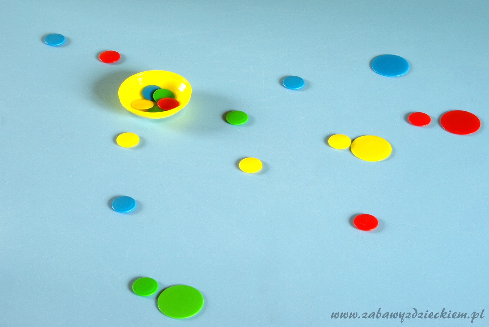 zestaw do gry w pchełki (plastikowe płaskie kółeczka w różnych kolorach, w dwóch rozmiarach: małe „pchełki” i duże „rakietki”, miseczka)