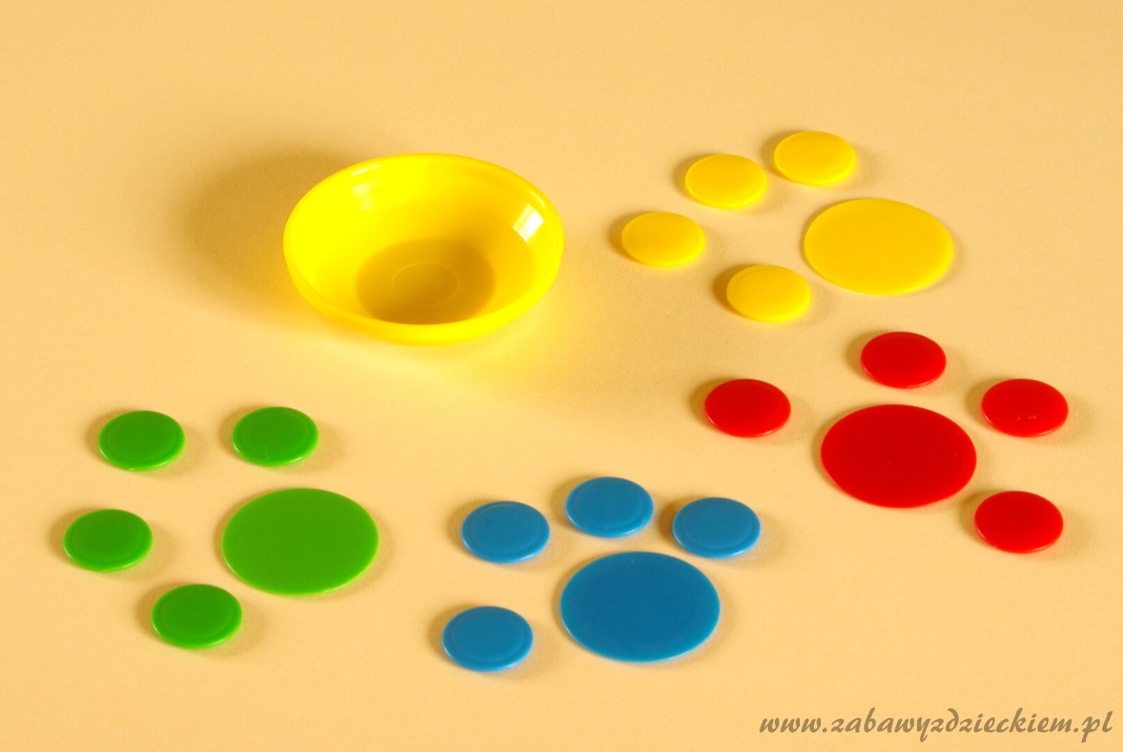 zestaw do gry w pchełki (plastikowe płaskie kółeczka w różnych kolorach, w dwóch rozmiarach: małe „pchełki” i duże „rakietki”, miseczka)