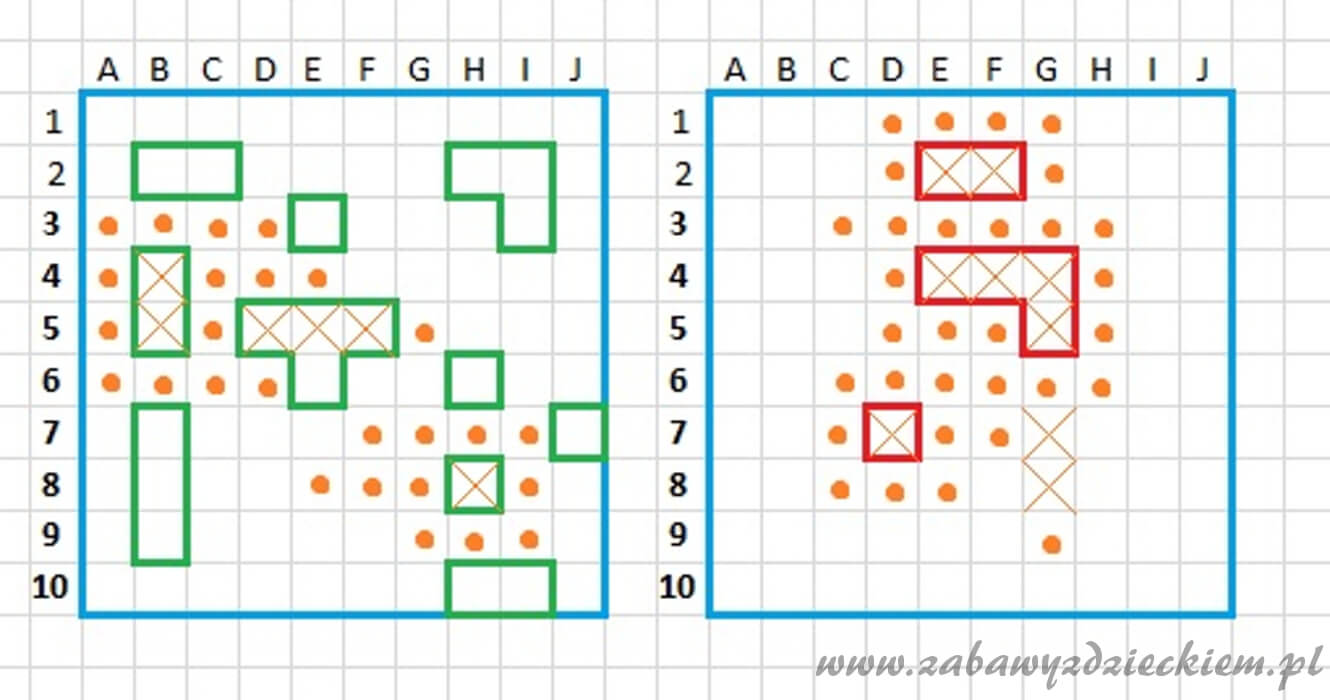 Każdy z graczy na swojej kartce rysuje dwa kwadraty o wielkości 10x10 kratek. Na górze, nad linią poziomą, każdą kratkę oznaczają kolejną literą alfabetu, od A do J, aż boku, wzdłuż linii pionowej – cyfrą, od 1 do 10. Następnie każdy z graczy rozmieszcza swoją flotę w jednym z narysowanych w ten sposób kwadratów. W skład floty wchodzi 10 statków: cztery łodzie podwodne (po jednej kratce), trzy ścigacze (po dwie kratki), dwa krążowniki (po trzy kratki) i jeden pancernik (cztery kratki). Można ustalić inne nazewnictwo floty: jeden pięciomasztowiec, jeden czteromasztowiec, dwa trójmasztowce, dwa dwój masztowce i dwa jednomasztowce (ilość masztów odpowiada liczbie kratek). Wokół każdego statku trzeba zostawić puste kratki, statki nie mogą też dotykać się rogami. Każdy z graczy stara się tak rozstawić flotę, by przeciwnik miał utrudnione zadanie, kiedy będzie się starał ją zatopić. W drugim kwadracie gracz zaznacza statki przeciwnika.