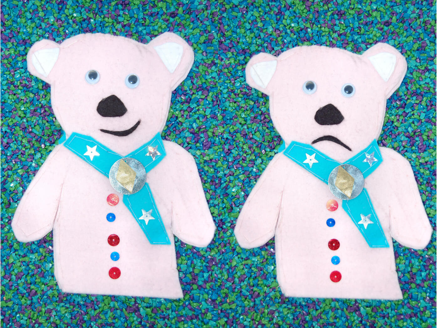 Z filcu wycinany dwukrotnie kształt postaci odpowiedniej wielkości, żeby dało się włożyć pacynkę na dłoń. Obie części filcu zszywamy ze sobą – w ten sposób otrzymujemy najważniejszą część pacynki. Teraz możemy „ubrać” i ozdobić pacynki w taki sam sposób jak pacynki ze skarpetek i rękawiczek >>.