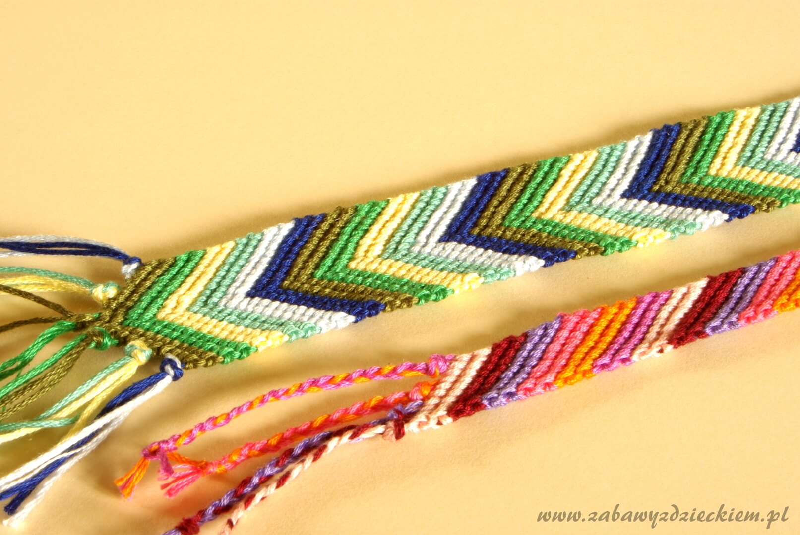 Jest to najprostszy wzór i warto zacząć właśnie od niego. Tutaj jest robiony tylko węzeł w prawo, co pozwala wyćwiczyć wiązanie kształtnych węzłów. Bransoleta robiona w ten sposób lubi się skręcać. Jeśli węzły robimy dokładnie, czyli jedną nitkę dobrze napinamy, a drugą starannie dociągamy do końca węzeł, to bransoleta nie skręci się. Gdyby jednak tak się stało, to po skończeniu możemy ją rozprasować żelazkiem z parą (nie za mocno nagrzanym) lub zwilżyć i wilgotną zawiązać na szklance lub innym okrągłym przedmiocie, i pozostawić do wyschnięcia. Przygotowujemy siedem różnokolorowych kawałków muliny (tak jak na rysunku, ale możemy dać mniej lub więcej kawałków, wtedy uzyskamy odpowiednio węższą lub szerszą bransoletę) o długości około 100–130 cm (w zależności od tego, jak długa ma być bransoleta). Końce z jednej strony wiążemy w supeł i dla wygody przypinamy agrafką na przykład do spodni lub do fotela, uważając, by nie zaciągnąć w nich nitek. Na rysunku każda kropka odpowiada jednemu całemu węzłowi w prawo. Zaczynamy od węzła pierwszego, który robimy nitką pierwszą znajdującą się po lewej stronie – zieloną na granatowej (rys. a). Po zrobieniu węzła zielona nitka znajduje się między granatową a czerwoną nitką. Drugi węzeł robimy tą samą nitką zieloną na napiętej nitce czerwonej (rys. b). Następne węzły robimy tak samo, aż zielona nitka znajdzie się po prawej stronie za żółtą nitką (rys. f). W ten sposób otrzymujemy pierwszy rządek zielonych węzłów. Po lewej stronie znajduje się granatowa nitka i to z niej teraz będziemy robić węzły w taki sam sposób, by uzyskać granatowy rządek węzłów (rys. g–l). Następnie powtarzamy wszystko aż do uzyskania pożądanej długości. W taki sam sposób możemy zrobić pasy w drugą stronę, ale robimy węzły w lewo i zaczynamy od prawej strony.