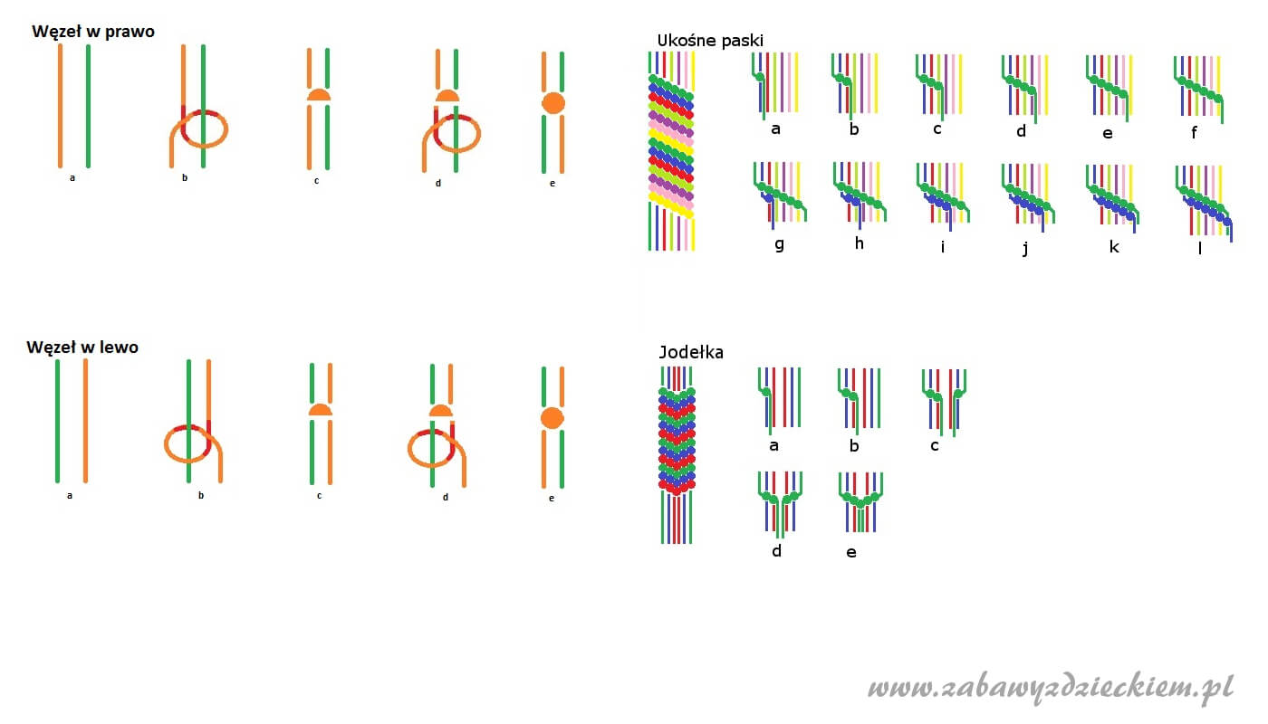 Poniżej znajduje się opis wykonania węzła w prawo i w lewo. Dobrze jest poćwiczyć najpierw same węzły, żeby równomiernie je zaciskać – potem możemy je rozwiązać. Jak już poćwiczymy, możemy zrobić na początek proste wzory. Na dole zamieszczamy opis wykonania dwóch prostych wzorów – skośnych pasów i jodełki.