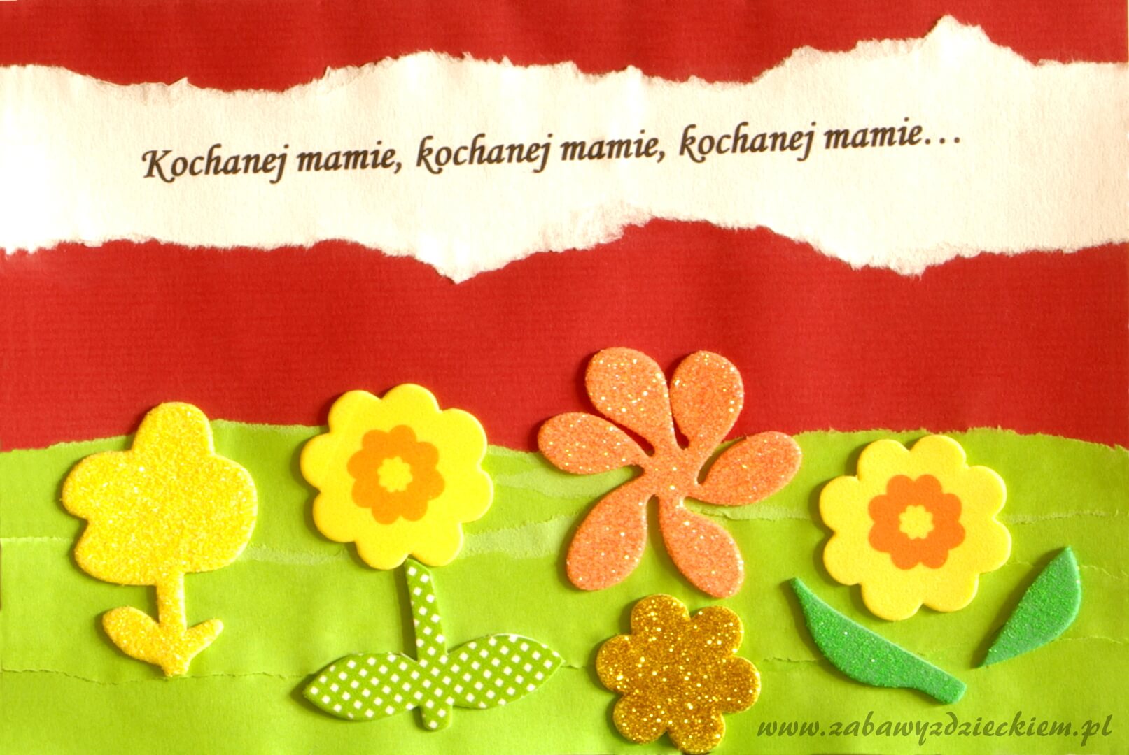 Na okładce tworzymy kolorową laurkę okazyjną. Różne kwiatki lub inne kształty wycinamy z pianki dekoracyjnej lub innego papieru i odpowiednio przyklejamy na okładce. Pewne elementy z papieru zamiast wycinać nożyczkami możemy wydzierać palcami – uzyska się ciekawy efekt papieru porwanego, jak to widać na pierwszym zdjęciu. Na tak przygotowanym białym pasku można zrobić napis „Dzień Mamy” lub inny. Możemy okładkę laurki dodatkowo ozdobić brokatem, wstążkami, sznurkami, guzikami. Pewne elementy możemy domalować kredkami, mazakami czy farbami.