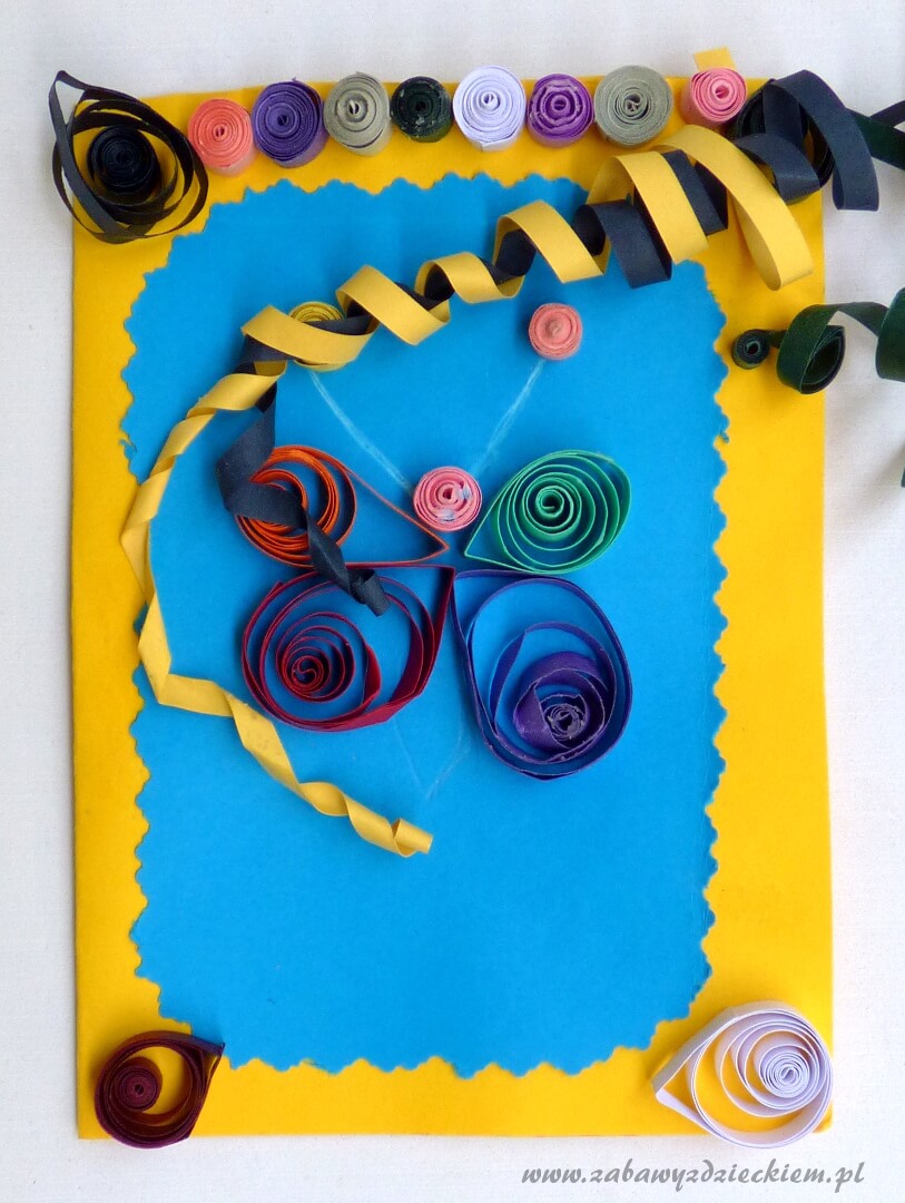 Laurkę wykonamy metodą quillingu. Jest to trójwymiarowa technika tworzenia ozdób z wąskich pasków papieru zwiniętych w kształt spiralki i odpowiednio uformowanych przez zagniecenie zewnętrznych warstw papieru. Elementy ze spiralek przygotowane w ten sposób są najczęściej naklejane na przygotowaną wcześniej powierzchnię tak, że powierzchnia zwiniętego paska jest prostopadła w stosunku do powierzchni podłoża.