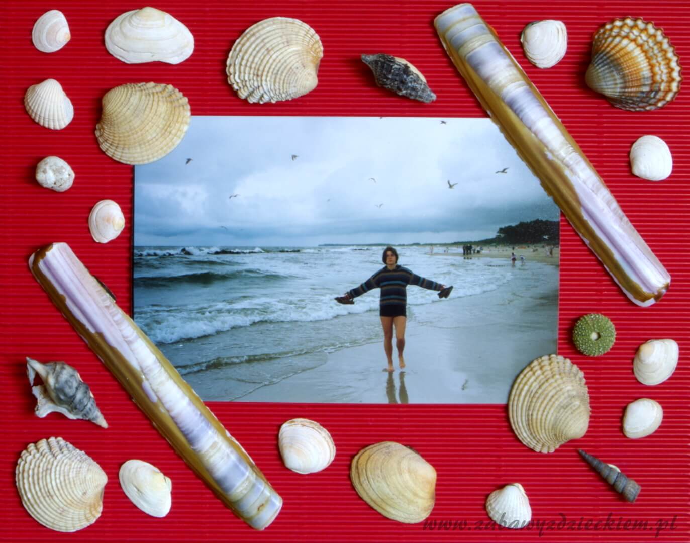 Teraz ramkę dekorujemy, przyklejając do niej muszelki i elementy z kolorowego papieru. Dodatkowe ozdoby można ewentualnie domalować farbami lub brokatem w pisaku. W ten sposób stworzymy piękną ramkę z muszelkami na wakacyjne zdjęcie znad morza.