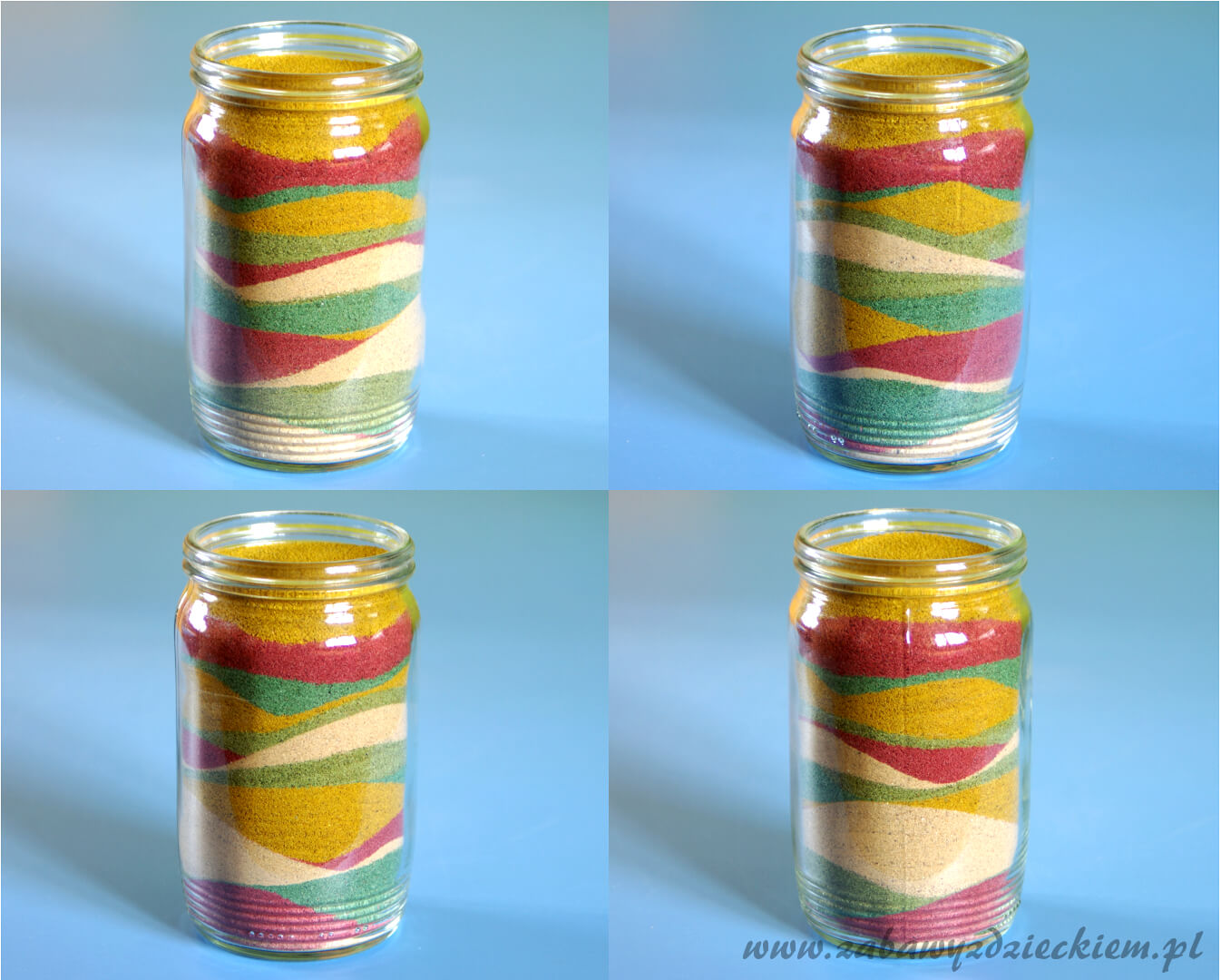 Szklane naczynie dokładnie myjemy i zdejmujemy z niego naklejki (jeśli są). Gdy kolorowy piasek całkiem wyschnie, może być konieczne ponowne przesianie go przez sitko, ponieważ podczas wysychania mogą się w nim utworzyć grudki. Wsypujemy go warstwami – naprzemiennie kolorami – do naczynia. Możemy to robić tak, by poszczególne warstwy piasku były z jednej strony grubsze, a z drugiej cieńsze – w ten sposób uzyskamy ciekawszy efekt wizualny.