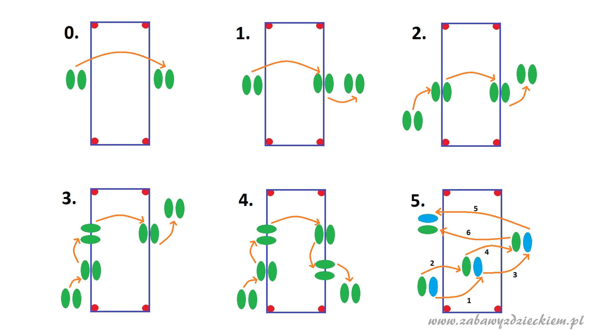 Czwórka – tak jak trójka, ale musimy jeszcze skoczyć na drugą linię gumy, by ją nadepnąć dwiema stopami.