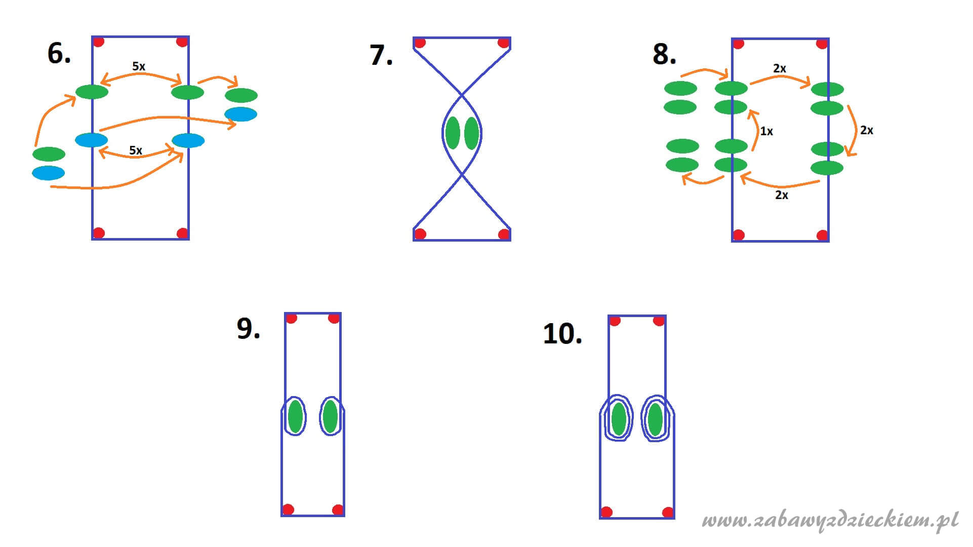 Trudniejsza wersja to tzw. „dziesiątka”, której też jest wiele rodzajów. Wykonuje się skoki od zera do dziesięciu. Przykładowa wersja jest pokazana na poniższych rysunkach.