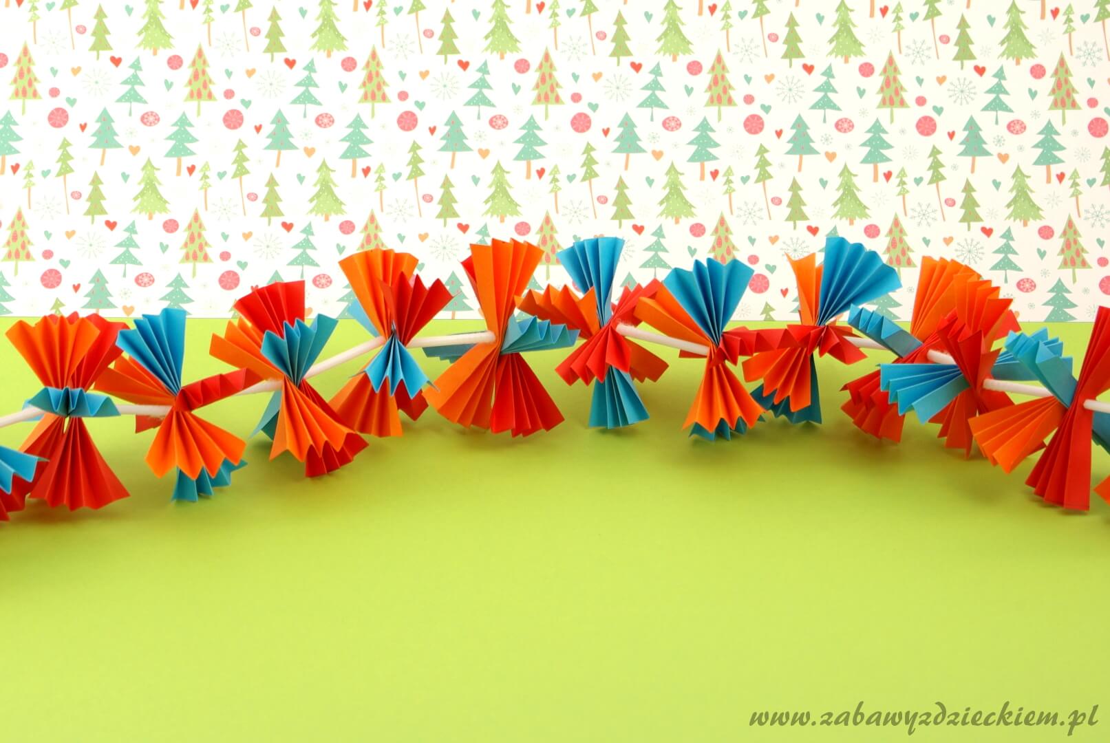 Kolorowy papier lub woreczki tniemy na kwadraty o wymiarach 5 na 5 cm i składamy je w harmonijkę. Z patyczków ściągamy watę i rozcinamy je na trzy równe części. Na igłę nawlekamy długi sznurek lub nitkę, na jednym końcu wiążemy spory supełek. Na nitkę nawlekamy na zmianę trzy harmonijki (przebijamy je na środku) i jeden patyczek. Jak skończy się nitka – dowiązujemy nową. Postępujemy tak aż uzyskamy pożądaną długość łańcucha.