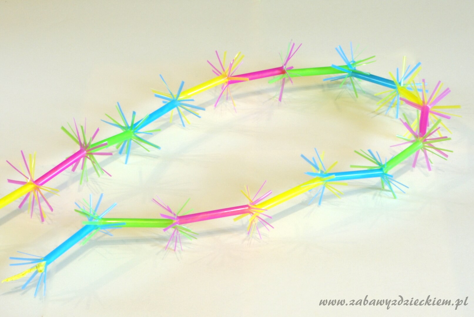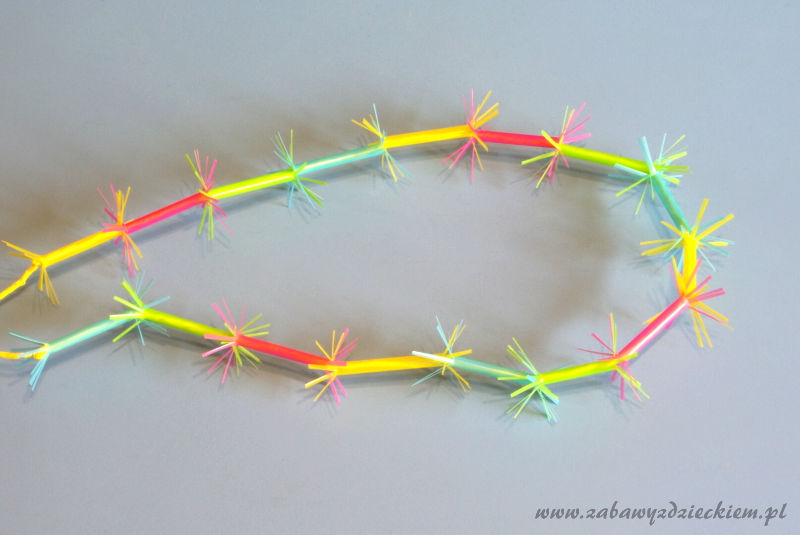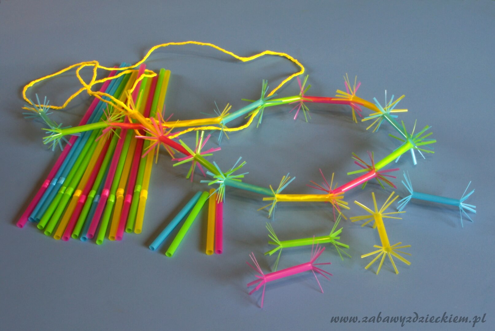 Na jednym końcu sznurka wiążemy supeł lub nawlekamy guzik lub koralik. Na sznurek nawlekamy pocięte słomki. Na drugim końcu sznurka również nawlekamy guzik lub koralik. W ten sposób powstanie efektowny łańcuch na choinkę.