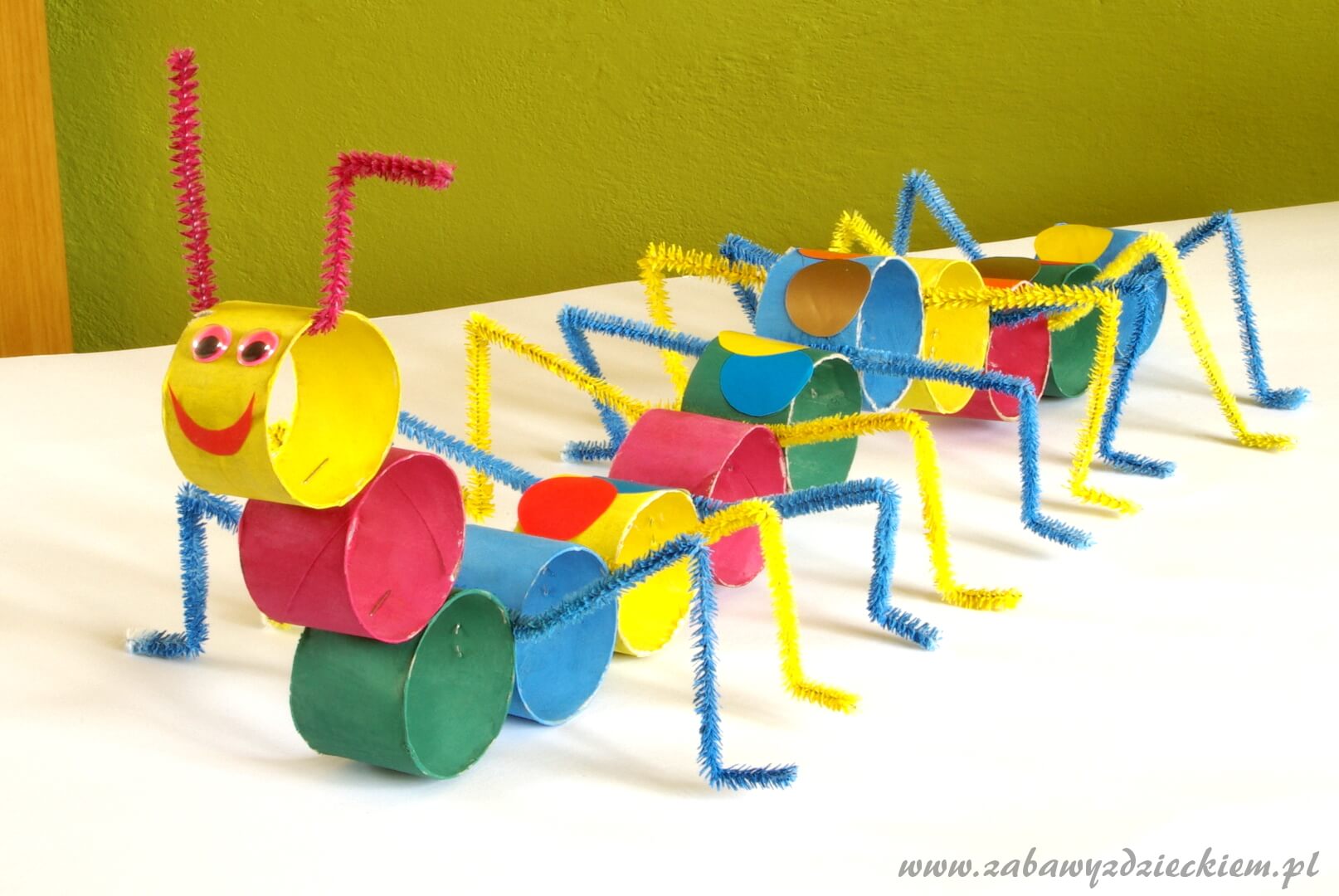 Jeśli mamy białe druciki kreatywne, malujemy je farbami na różne kolory i odkładamy do wyschnięcia. Potem przyklejamy środki tych drucików do gąsienicy pomiędzy rolki i formujemy z nich nóżki. Na pierwszej rolce możemy przykleić z papieru lub namalować oczy, buzię. Przyklejamy krótszy drucik kreatywny i formujemy czułka. Na pozostałych rolkach również możemy zrobić różne wzorki z papieru kolorowego.