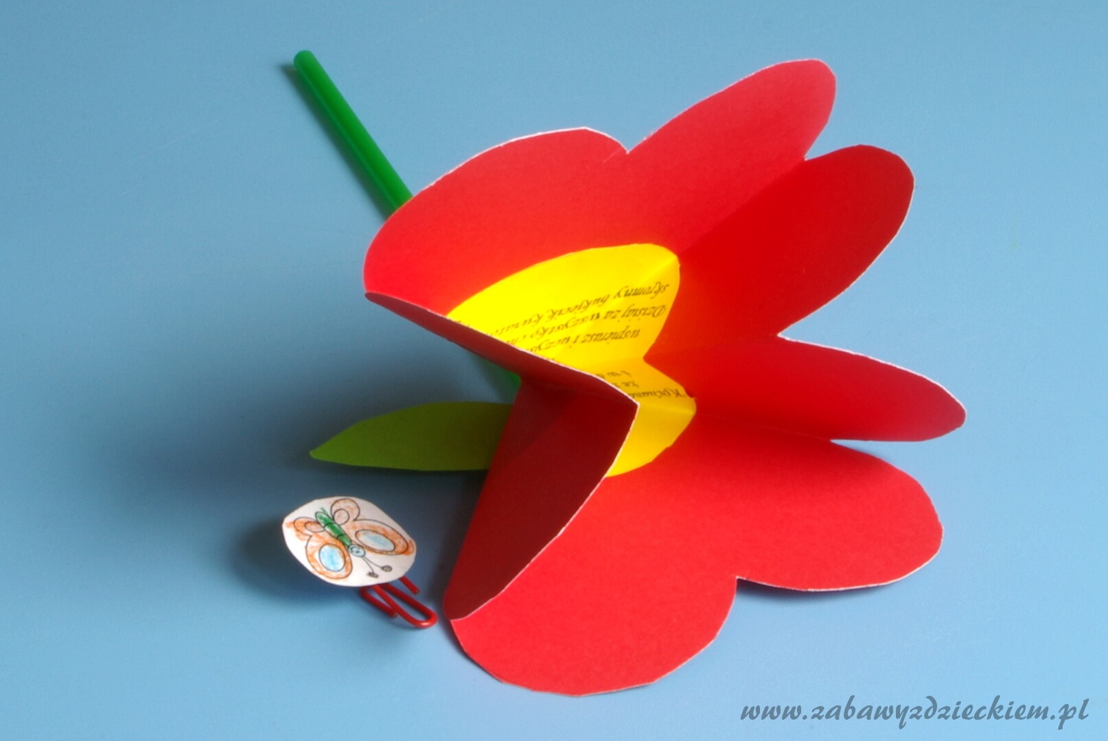 Tak przygotowany kwiatek składamy – powinniśmy otrzymać kształt serca. Do serca pod spodem przyklejamy wycięty z zielonego papieru listek oraz zieloną słomkę jako łodygę. Na białej kartce robimy malutki rysunek motylka w kółku o średnicy około 2,5 cm i kolorujemy go. Rysunek motylka wycinamy i przyklejamy taśmą do spinacza tak, by krótsze ramię spinacza było wolne. W ten sposób otrzymujemy ozdobną zapinkę, którą spinamy serce, by się nam nie otwierało.