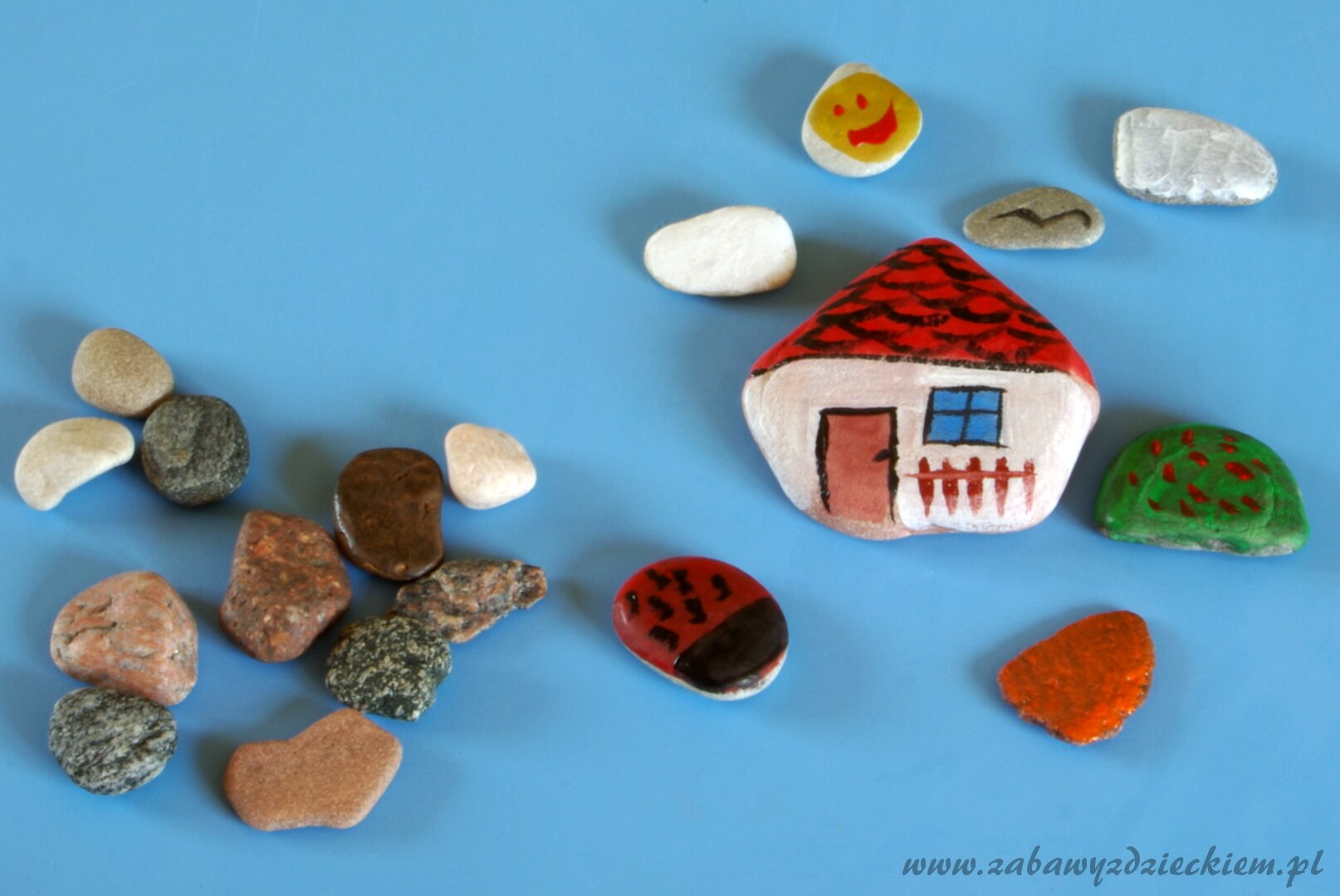Na wakacjach nad morzem, jeziorem, rzeką zbieramy różnego rodzaju kamienie. Najlepsze są płaskie i gładkie. Farbami malujemy na nich różne wzory. Na dużych kamieniach można namalować obrazek, a z małych ułożyć kompozycję, po czym pomalować każdy kamień odpowiednim kolorem, zgodnie z projektem.