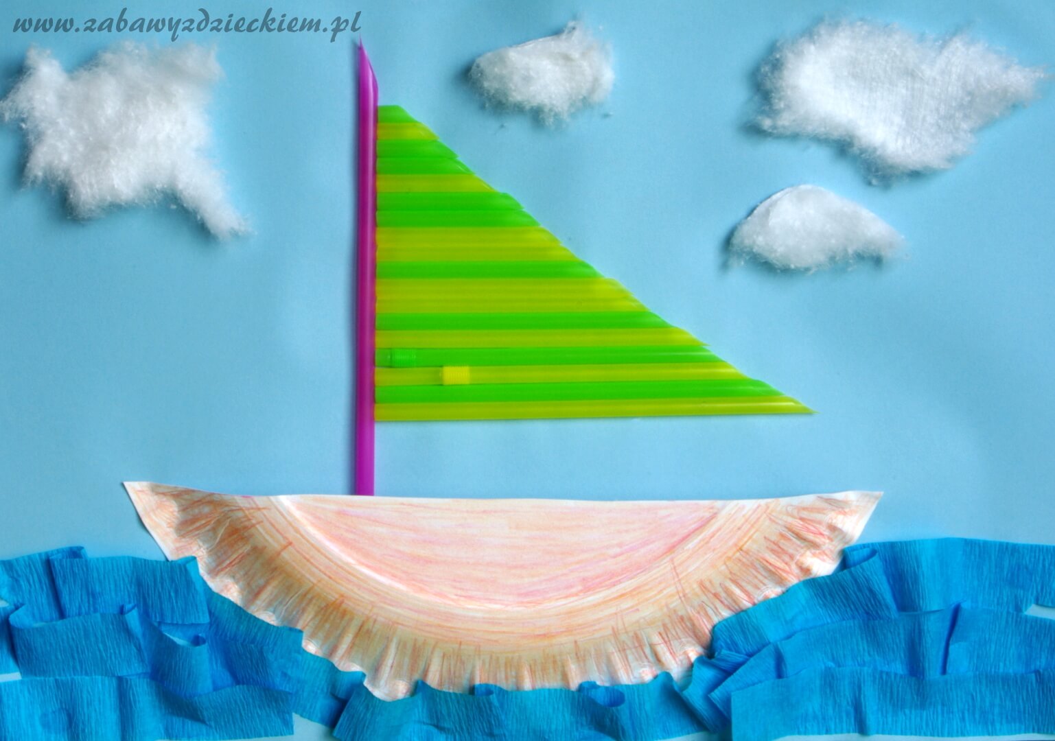 Maszt i żagiel przygotowujemy ze słomek do napojów. Jeśli mamy kolorowe słomki, możemy ułożyć z nich kolorystyczny wzór. Słomki przycinamy na odpowiednią długość i przyklejamy do kartki w odpowiednim miejscu.
