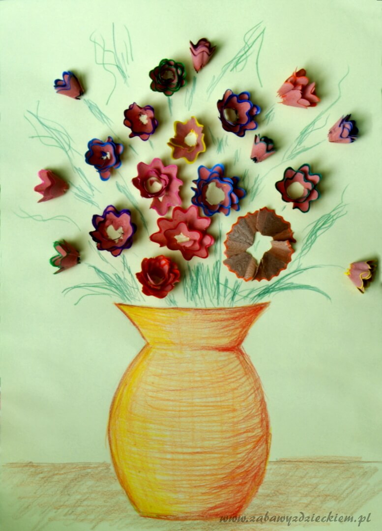 Na kartce projektujemy jakąś kompozycję. Następnie wyklejamy elementy kompozycji obierkami z kredek. Brakujące elementy możemy uzupełnić papierem kolorowym lub domalować farbami, kredkami lub mazakami.