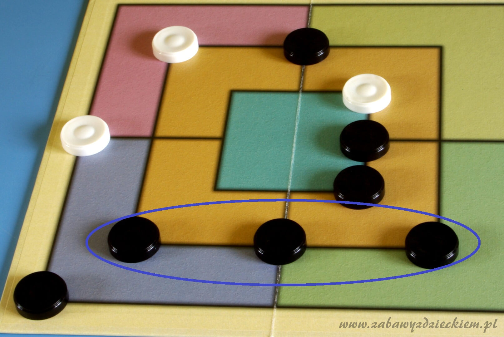 Jeżeli po piętnastu ruchach „ciemnymi” pionkami nie uda się zamknąć młynka, to przegrywają, jak uda im się – zwyciężają.