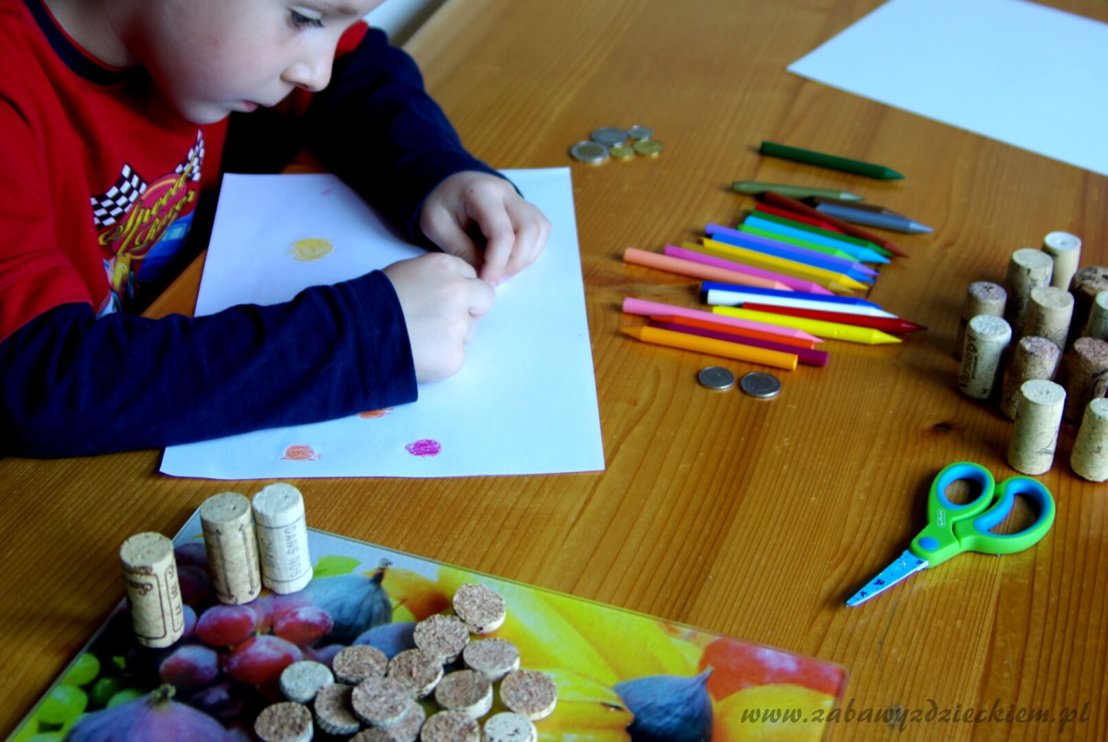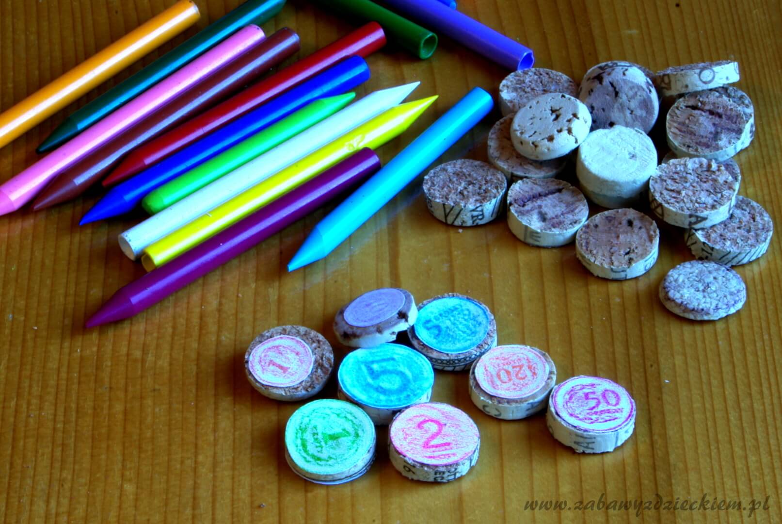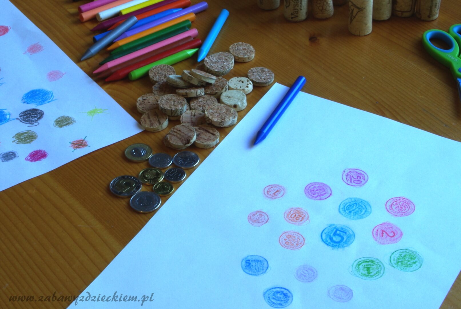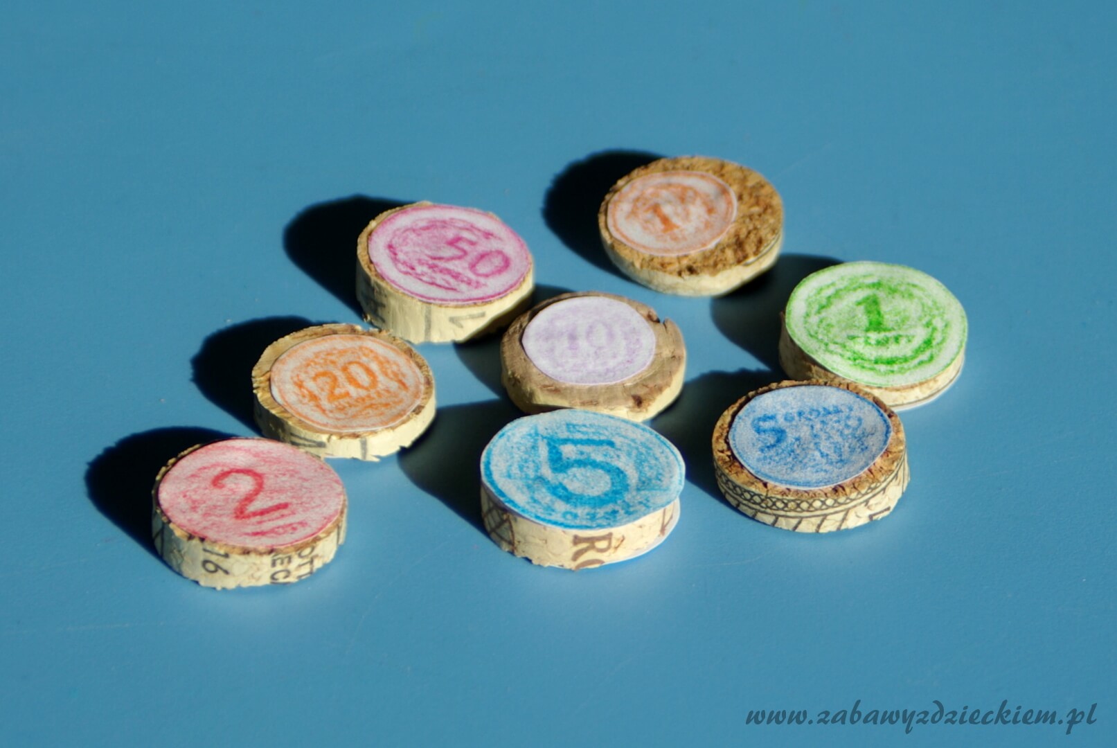 W tak prosty, a zarazem ciekawy sposób możemy przygotować wiele monet do zabawy w sklep. Takie monety można przeliczać – dziecko ma okazję nauczyć się liczenia, poznać koncepcję zbiorów, a także poćwiczyć ocenę wartości pieniędzy.