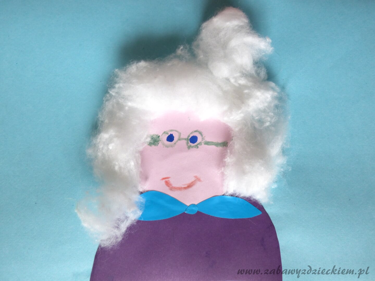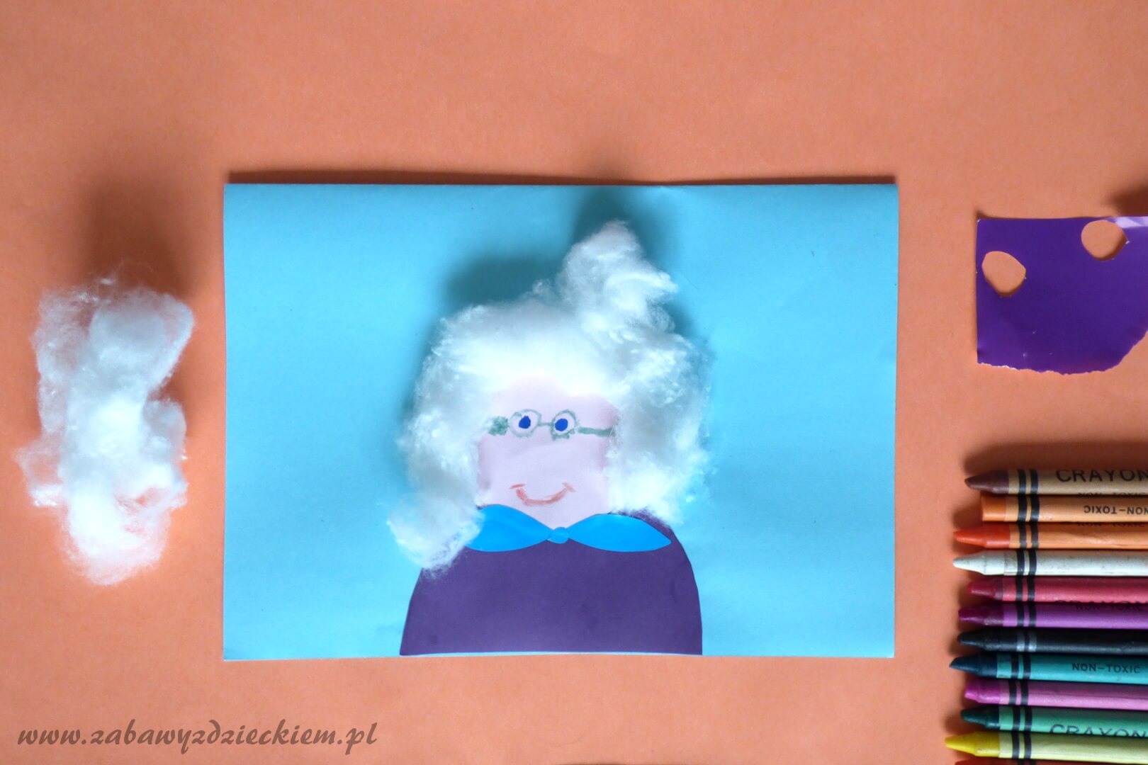 Najpierw zginamy kartkę z bloku technicznego na pół. Następnie z kolorowego papieru wycinamy kształt tułowia i przyklejamy go na kartkę. Potem wycinamy kształt kokardy, którą naklejamy w miejscu, gdzie będzie znajdować się szyja babci. Teraz wycinamy okrąg, który będzie głową i rysujemy na nim kredkami buzię, nos, oczy oraz okulary i brwi. Gotową głowę przyklejamy nad wcześniej doklejoną kokardą. Na koniec z waty kosmetycznej wykonujemy włosy i przyklejamy je przy głowie.