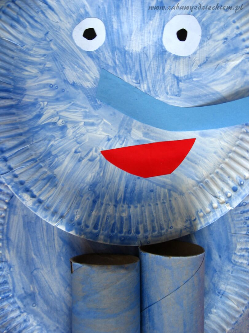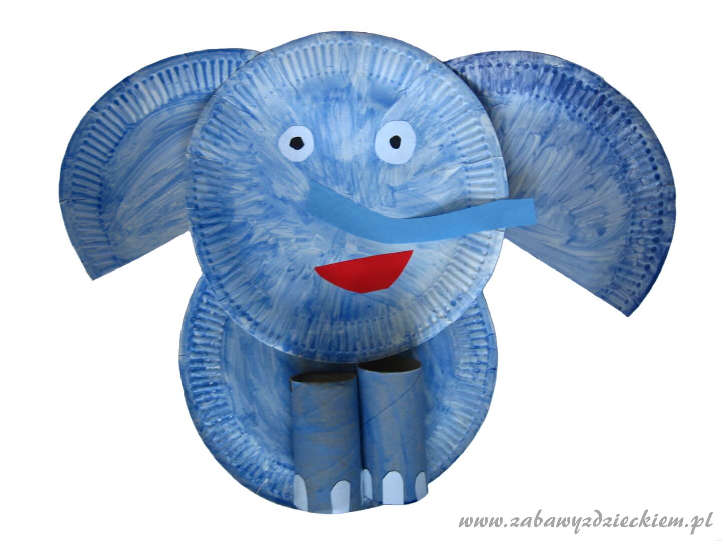 W międzyczasie, z kolorowego papieru lub bloku technicznego, wycinamy buzię, oczy, oraz trąbę i pazury. Kiedy talerzyki już wyschną, przyklejamy oczy, buzię oraz trąbę do talerzyka, który ma być głową słonia. Pazury przyklejamy do rolek, a gotowe nogi słonia – do talerzyka stanowiącego tułów zwierzęcia. Na koniec przyklejamy do głowy uszy z przeciętego wcześniej na pół talerzyka.