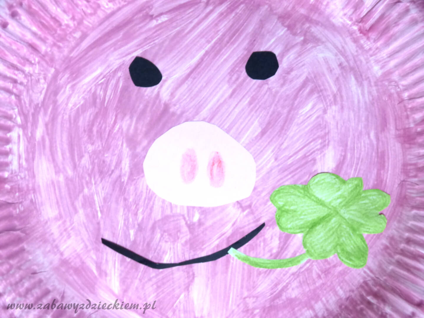 Na koniec, aby świnka wyglądała bardziej atrakcyjnie, można z zielonego papieru wyciąć kształt koniczynki i przykleić go do buzi świnki. Dodatkowo możemy zrobić zakręcony ogonek i przykleić go od spodniej strony talerzyka.